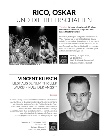 VINCENT KLIESCH LIEST AUS SEINEM THRILLER %u201eAURIS %u2013 PULS DER ANGST%u201cLesung In seiner Lesung taucht Vincent Kliesch mit den Zuh%u00f6rerinnen und Zuh%u00f6rern in den spannenden Abschlussteil seiner Serie ein: Denn im sechsten Band der Thriller-Reihe des Bestseller-Duos Sebastian Fitzek und Vincent Kliesch wird das Leben von True-Crime-Podcasterin Jula Ansorge komplett auf den Kopf gestellt. Sie kann es nicht fassen: Ihre eigene Mutter hat sie belogen, die Demenz warnur vorgespielt! Und das war noch die geringste L%u00fcge.Donnerstag, 23. Oktober 2025,ab 19.00 Uhr, Rathaus, Rheder Ei,Rathausplatz 9, RhedeFoto: Marcus H%u00f6hnFreitag, 04. April 2025, ab 17.00 Uhr, LWL Textilwerk (Drosselsaal),Industriestra%u00dfe 5, BocholtFoto: Marc LontzekRICO, OSKAR UND DIE TIEFERSCHATTENTheater f%u00fcr junge Menschen ab 10 Jahrenvon Andreas Steinh%u00f6fel, aufgef%u00fchrt vomLandestheater DetmoldRico ist elf, tiefbegabt und geht zur F%u00f6rderschule. Viele Freunde hat er nicht. Rico liebt es, Dingen auf die Spur zu gehen. Leider kann er sich schlecht Sachen merken. Da lernt er Oskar kennen, der ist das Gegenteil von Rico, er ist n%u00e4mlich hochbegabt. Eines haben sie aber gemeinsam: sie stellen gerne detektivische Ermittlungen an.Veranstalter: Stadttheater Bocholt e. V.Kultur9