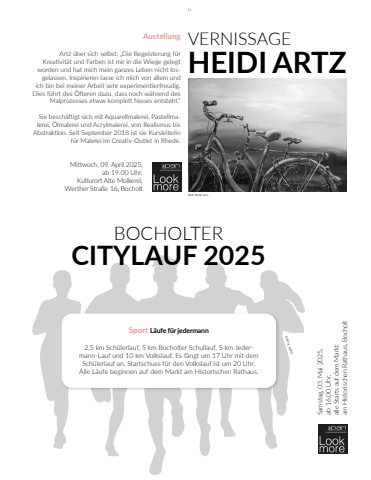 AustellungArtz %u00fcber sich selbst: %u201eDie Begeisterung f%u00fcr Kreativit%u00e4t und Farben ist mir in die Wiege gelegt worden und hat mich mein ganzes Leben nicht losgelassen. Inspirieren lasse ich mich von allem und ich bin bei meiner Arbeit sehr experimentierfreudig. Dies f%u00fchrt des %u00d6fteren dazu, dass noch w%u00e4hrend des Malprozesses etwas komplett Neues entsteht.%u201cSie besch%u00e4ftigt sich mit Aquarellmalerei, Pastellmalerei, %u00d6lmalerei und Acrylmalerei, von Realismus bis Abstraktion. Seit September 2018 ist sie Kursleiterin f%u00fcr Malerei im Creativ-Outlet in Rhede.Mittwoch, 09. April 2025,ab 19.00 Uhr, Kulturort Alte Molkerei,Werther Stra%u00dfe 16, BocholtSamstag, 03. Mai 2025, ab 16.00 Uhr, alle Starts auf dem Markt am Historischen Rathaus, BocholtBild: Heidi ArtzVERNISSAGEHEIDI ARTZBOCHOLTER CITYLAUF 2025Sport L%u00e4ufe f%u00fcr jedermann2,5 km Sch%u00fclerlauf, 5 km Bocholter Schullauf, 5 km Jedermann-Lauf und 10 km Volkslauf. Es f%u00e4ngt um 17 Uhr mit dem Sch%u00fclerlauf an. Startschuss f%u00fcr den Volkslauf ist um 20 Uhr. Alle L%u00e4ufe beginnen auf dem Markt am Historischen Rathaus.Grafik: Freepik11