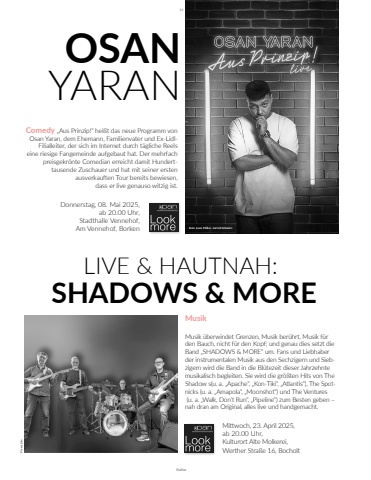 Donnerstag, 08. Mai 2025, ab 20.00 Uhr, Stadthalle Vennehof,Am Vennehof, BorkenOSAN YARANComedy %u201eAus Prinzip!%u201c hei%u00dft das neue Programm von Osan Yaran, dem Ehemann, Familienvater und Ex-LidlFilialleiter, der sich im Internet durch t%u00e4gliche Reels eine riesige Fangemeinde aufgebaut hat. Der mehrfach preisgekr%u00f6nte Comedian erreicht damit Hunderttausende Zuschauer und hat mit seiner ersten ausverkauften Tour bereits bewiesen, dass er live genauso witzig ist.Foto: Leon F%u00fclber, Astrid SchmitzMusikMusik %u00fcberwindet Grenzen, Musik ber%u00fchrt, Musik f%u00fcr den Bauch, nicht f%u00fcr den Kopf; und genau dies setzt die Band %u201eSHADOWS & MORE%u201c um. Fans und Liebhaber der instrumentalen Musik aus den Sechzigern und Siebzigern wird die Band in die Bl%u00fctezeit dieser Jahrzehnte musikalisch begleiten. Sie wird die gr%u00f6%u00dften Hits von The Shadow s(u. a. %u201eApache%u201c, %u201eKon-Tiki%u201c, %u201eAtlantis%u201c), The Spotnicks (u. a. %u201eAmapola%u201c, %u201eMoonshot%u201c) und The Ventures (u. a. %u201eWalk, Don%u2019t Run%u201c, %u201ePipeline%u201c) zum Besten geben %u2013 nah dran am Original, alles live und handgemacht.Mittwoch, 23. April 2025,ab 20.00 Uhr, Kulturort Alte Molkerei, PressefotoWerther Stra%u00dfe 16, BocholtLIVE & HAUTNAH: SHADOWS & MORE14Kultur