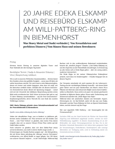 PrologKirstens letzter Eintrag in unserem digitalen Team- und Paar-Kalender f%u00fcr den heutigen Tag lautet: Best%u00e4tigter Termin | Nadja & Alexander Elskamp | Vino | Besprechung Jubil%u00e4umWie so oft in unserem PANischen Zusammenleben %u2026 Kirsten kennt ihre Kunden schon eine gef%u00fchlte Ewigkeit %u2026 wenn man 20 Jahre als solche bezeichnen m%u00f6chte. F%u00fcr mich sind es viele Bekanntschaften, denen wir immer mal wieder begegnen, ohne dass ich wei%u00df, wie die Menschen wirklich ticken. Deshalb sehe ich diesem intensiveren Kennenlernen heute Abend mit Spannung entgegen %u2013 zumal sich mir der Grund f%u00fcr die Jubil%u00e4ums-Besprechung auf den ersten Blick nicht erschlossen hat. Weil: Schon im letzten Jahr galt es, auf 75 Jahre Elskamp zur%u00fcckzublicken %u2013 auf die Drei-GenerationenKaufmannsgeschichte, deren Wurzeln bis zum Ende des zweiten Weltkrieges reichen: 1949: Maria Elskamp gr%u00fcndet einen Kolonialwarenhandel auf der Petersfeldstra%u00dfe in Biemenhorst.Quelle: www.edeka-elskamp.de/mein-elskamp/Neben der abendlichen Frage, was es konkret zu jubilieren gilt, kreisen meine Gedanken um: Was servieren wir den beiden zum Essen %u2026 zum Vino? Schwer zu glauben, dass meine Frau davon ausgeht, dass wir zu unserer Dinner-Prime-Time nichts auf der Gabel haben werden. Noch schwerer zu glauben, dass wir dem Edeka-Paar etwas servieren k%u00f6nnten, was nicht in deren Markt erjagt wurde ;-) Erinnerungen an Claudia Buchow poppen auf %u2013 die Metzgersfrau, die mit ihrem Mann jahrelang die %u201eMetzger unseres Vertrauens%u201c verk%u00f6rperten, wie Alfred Biolek zu sagen pflegte. Nur 150 Meter von unserer Haust%u00fcr entfernt %u2026 in der Osterstra%u00dfe. W%u00e4hrend Ralf Buchow sich in den wohlverdienten Ruhestand verabschiedete, heuerte die %u201edeutlich j%u00fcngere%u201c Claudia ;-) bei Edeka Elskamp an, um ihre Expertise an der Fleischtheke einzubringen. In Erinnerung an alte Zeiten soll es Dicke Rippe geben %u2013 aber ein wenig anders, moderner interpretiert. Die Dicke Rippe ist bei meiner Elskamp%u2019schen Einkaufstour pr%u00e4sent, noch dazu im Sonderangebot %u2013 Claudia hingegen hat an diesem Tag frei.Zur Vorspeise entscheide ich mich spontan f%u00fcr ein LeberwurstTasting aus der reichhaltigen Elskamp-Auswahl %u2013 mit einem St%u00fcck guter Butter und ein paar Backwerken von B%u00fcsch: einem Picco Pikante mit Meersalz und schwarzem Pfeffer sowie einem traditionellen La B%u00fcschette. Dazu wird es ein paar %u00e0 la minute geschmorte Zwiebeln in S%u00fc%u00dfwein-Butter geben. Etwas mehr Vorbereitung und Schmorzeit erfordert die %u201eDicke Rippe Asia-Style%u201c. W%u00e4hrend diese mit asiatischen Zutaten wie Koriander, Ingwer, Zitronengras etc. im Sud k%u00f6chelt, sp%u00fcre ich das auf, was Nadja, Alexander und das Team Elskamp im Netz an Spuren hinterlassen haben, und die Antwort auf die Frage: Wer war eigentlich Willi Pattberg %u2013 der Namensgeber f%u00fcr die Firmenanschrift?Nachdem 1998 von der Stadt Bocholt die Fl%u00e4chen der Bauernh%u00f6feHegering und M%u00f6llenbeck aufgekauft wurden, werden sie einer Wohnbebauung zugef%u00fchrt. In diesem Zusammenhang ist an der Birkenallee ein neues Versorgungszentrum im Bau. Da in der Bocholter Gemeinde Biemenhorst seit Jahren kein geeigneter Saal f%u00fcr Versammlungen, Festlichkeiten, Familienfeiern oder sonstigeAktivit%u00e4ten zur Verf%u00fcgung steht, wird in Verbindung damit ein Gemeindezentrum errichtet.Quelle: www.buergerverein-biemenhorst.de/index.php/ueberuns/ueber-uns-220 JAHRE EDEKA ELSKAMP UND REISEB%u00dcRO ELSKAMP AM WILLI-PATTBERG-RING IN BIEMENHORSTWas Heavy Metal und Sushi verbindet | Von Kreuzfahrten und perfekten Dinnern | Vom blauen Haus und seinen Bewohnern27Coverstory