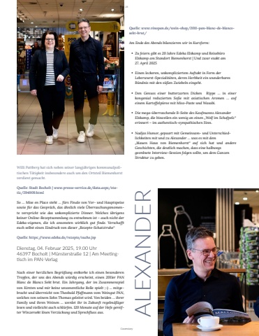 Willi Pattberg hat sich neben seiner langj%u00e4hrigen kommunalpolitischen T%u00e4tigkeit insbesondere auch um den Ortsteil Biemenhorst verdient gemacht.Quelle: Stadt Bocholt | www.presse-service.de/data.aspx/static/294909.htmlSo %u2026 Mise en Place steht %u2026 f%u00fcrs Finale von Vor- und Hauptspeise sowie f%u00fcr das Gespr%u00e4ch, das %u00e4hnlich viele %u00dcberraschungsmomente verspricht wie das unkomplizierte Dinner. Welches %u00fcbrigens keiner Online-Rezeptsammlung zu entnehmen ist %u2013 auch nicht der Edeka-eigenen, die ich ansonsten wirklich gut finde. Verschafft euch selbst einen Eindruck von dieser %u201eRezepte-Schatztruhe%u201cQuelle: https://www.edeka.de/rezepte/suche.jspDienstag, 04. Februar 2025, 19.00 Uhr 46397 Bocholt | M%u00fcnsterstra%u00dfe 12 | Am Meetingtisch im PAN-Verlag Nach einer herzlichen Begr%u00fc%u00dfung entkorke ich einen besonderen Tropfen, der uns des Abends w%u00fcrdig erscheint, einen 2011er PAN Blanc de Blancs Sekt brut. Ein Jahrgang, der im Zusammenspiel von Kirsten und mir keine unwesentliche Rolle spielt ;-) %u2026 mitgebracht und %u00fcberreicht von Theobald Pfaffmann vom Weingut PAN, welches von seinem Sohn Thomas geleitet wird. Von beiden %u2026 ihrer Family und ihren Weinen %u2026 werdet ihr in Zukunft regelm%u00e4%u00dfiger lesen und vielleicht auch schl%u00fcrfen. 120 Monate auf der Hefe gereifter Winzersekt l%u00f6sen Verz%u00fcckung und Sprechfluss aus. Quelle: www.vinopan.de/wein-shop/2011-pan-blanc-de-blancssekt-brut/Am Ende des Abends bilanzieren wir in Kurzform:%u2022 Zu feiern gibt es 20 Jahre Edeka Elskamp und Reiseb%u00fcro Elskamp am Standort Biemenhorst | Und zwar exakt am 27. April 2025%u2022 Einen leckeren, unkompliziertem Auftakt in Form der Leberwurst-Spezialit%u00e4ten, deren Herbheit ein wunderbares B%u00fcndnis mit den s%u00fc%u00dfen Zwiebeln eingeht.%u2022 Den Genuss einer butterzarten Dicken Rippe %u2026 in einer kongenial reduzierten So%u00dfe mit asiatischen Aromen %u2026 auf einem Kartoffelp%u00fcree mit Miso-Paste und Wasabi.%u2022 Die mega-%u00fcberraschende B-Seite des Kaufmanns Alexander Elskamp, die bisweilen ein wenig an einen %u201eWolf im Schafpelz%u201c erinnert %u2013 im authentisch-sympathischen Sinn.%u2022 Nadjas Humor, gepaart mit Gemeinsam- und Unterschied- lichkeiten mit und zu Alexander %u2026 was es mit dem %u201eblauen Haus von Biemenhorst%u201c auf sich hat und andere Geschichten, die deutlich machen, dass eine halbwegs geordnete Interview-Session folgen sollte, um dem Ganzen Struktur zu geben. ALEXANDER28Coverstory