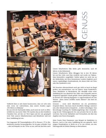 Vielleicht l%u00e4sst es sich damit beantworten, dass wir sehr stolz sind, wenn wir wahrnehmen, dass unsere Kunden sagen: %u201eWir fahren zu Elskamp.%u201c Bei uns tritt die Dachmarke Edeka, auch wenn sie noch so offensichtlich ist, ins zweite Glied. Wir machen das an dem famili%u00e4ren Charakter fest, auf den wir Wert legen und der uns gespiegelt wird. Viele unserer Mitarbeiterinnen und Mitarbeiter sind seit ihrer Ausbildung bei uns. Von insgesamt 110 Teammitgliedern (35 in Stenern | 75 in Biemenhorst) einzelne herauszugreifen, ist ein ganz schmaler Grat %u2026 aber mit Respekt vor der Treue zu uns, seht mir das bitte nach: Unsere Mitarbeiterin Elke Bothe geht demn%u00e4chst, nach 40 Jahren, in den Ruhestand. Unsere Mitarbeiterin Silvia Allroggen hat in den 38 Jahren bei uns ihre Liebe zum K%u00e4se entdeckt und wurde zur DiplomK%u00e4se-Sommeli%u00e8re ausgebildet. Seither gl%u00e4nzt sie nicht nur an der Bedientheke mit ihren Kenntnissen, sondern begleitet auch unsere regelm%u00e4%u00dfigen Kundenabende, bei denen K%u00e4se mit Wein oder Bier kombiniert wird.Wir brauchen alterstechnisch auch gar nicht so hoch ins Regal greifen, um auszudr%u00fccken, was wir sp%u00fcren: Jonas Dunkerbeck, unser Marktleiter in Biemenhorst, der ebenfalls schon seine Ausbildung bei uns absolviert hat, h%u00e4tte zum Zeitpunkt unseres Gespr%u00e4chs eigentlich Urlaub gehabt. Einem pl%u00f6tzlichen Engpass im Bereich der F%u00fchrung begegnete er augenzwinkernd mit den Worten: %u201eHarte Zeiten schaffen starke M%u00e4nner!%u201c Das fand ich einfach toll. Genauso %u2026 wenn mich Mitarbeiter um ein pers%u00f6nliches Gespr%u00e4ch bitten. Das kann durch berufliche Belange motiviert sein, aber oftmals sind es Gespr%u00e4che ... in allen Lebenslagen. Vom Bewerbungs-Coaching f%u00fcr Familienangeh%u00f6rige %u00fcber Unterst%u00fctzung bei der Wohnungssuche bis zum privaten Rat ist da alles vertreten. Das ist die Nahbarkeit und Vertrautheit, die %u00fcber das Angebot zum Duzen hinausgeht. Mein Cousin Peter Dammeyer zum Beispiel ist Marktleiter in Stenern. Auch er hat seine Ausbildung bei uns gemacht. Nach einigen Wanderjahren in Berlin ist er zu uns zur%u00fcck, um eine F%u00fchrungsrolle bei Edeka Elskamp zu %u00fcbernehmen. GENUSS32Coverstory