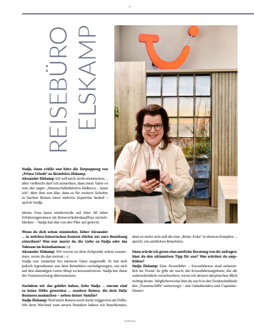 REISEB%u00dcRO ELSKAMP Nadja, dann erkl%u00e4r uns bitte die Entpuppung von %u201ePrima Urlaub%u201c zu Reiseb%u00fcro Elskamp.Alexander Elskamp: Ich will mich nicht einmischen %u2026 aber vielleicht darf ich anmerken, dass mein Vater es war, der sagte: %u201eMannschaftsfahrten Mallorca %u2026 kann ich.%u201c Aber ihm war klar, dass es f%u00fcr weitere Schritte in Sachen Reisen einer tieferen Expertise bedarf %u2013 sprich Nadja. Meine Frau kann mittlerweile auf %u00fcber 30 Jahre Erfahrungswissen als Reiseverkehrskauffrau zur%u00fcckblicken %u2013 Nadja hat das von der Pike auf gelernt. Wenn du dich schon einmischst, lieber Alexander %u2026 in welchen historischen Kontext d%u00fcrfen wir eure Beziehung einordnen? Was war zuerst da, die Liebe zu Nadja oder das Vakuum im Reisebusiness ;-) Alexander Elskamp: Wir waren zu dem Zeitpunkt schon zusammen, wenn du das meinst ;-) Nadja war zun%u00e4chst bei meinem Vater angestellt. Er hat sich jedoch irgendwann aus dem Reiseb%u00fcro zur%u00fcckgezogen, um sich auf den damaligen Lotto-Shop zu konzentrieren. Nadja hat dann die Verantwortung %u00fcbernommen.Nachdem wir das gekl%u00e4rt haben, liebe Nadja %u2026 warum sind es keine D%u00fcfte geworden %u2026 sondern Reisen, die dein Daily Business ausmachen %u2013 neben deiner Familie? Nadja Elskamp: Weil mich Reisen noch mehr triggerten als D%u00fcfte. Mit dem Wechsel zum neuen Standort haben wir beschlossen, dass es mehr sein soll als eine %u201eReise-Ecke%u201c in diesem Komplex %u2026 sprich, ein amtliches Reiseb%u00fcro. Dann w%u00fcrde ich gerne eine amtliche Beratung von dir anfragen. Hast du den ultimativen Tipp f%u00fcr uns? Was w%u00fcrdest du empfehlen? Nadja Elskamp: Eine Kreuzfahrt %u2013 Kreuzfahrten sind unheimlich im Trend. Es gibt sie noch, die Kreuzfahrtangebote, die dir wahrscheinlich vorschweben, wenn ich deinen skeptischen Blick richtig deute. M%u00f6glicherweise bist du noch in der Denkschublade des %u201eTraumschiffs%u201c unterwegs %u2013 mit Galaabenden und CaptainsDinner. 33Coverstory