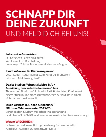 Wiegrink %u0336solider Boden &starkePerspektivenUND MELD DICH BEI UNS!SCHNAPP DIR DEINE ZUKUNFTIndustriekaufmann/-frauDu h%u00e4ltst den Laden am Laufen! Von Einkauf bis Buchhaltung %u2013 du managst Zahlen, Prozesse und Kundenanfragen.Kauff rau/-mann f%u00fcr B%u00fcromanagementOrganisati on ist dein Ding? Dann wirst du in unserem B%u00fcro zum Multi tasking-Profi !Duales Studium Wirtschaft slehre B.A. + Ausbildung zum Industriekaufmann/-frauTheorie und Praxis perfekt kombiniert! Starte deine Karriere miteinem Studium und einer kaufm%u00e4nnischen Ausbildung in einemUnternehmen mit Zukunft .Duale Variante B.A. ohne Ausbildung/ NEU zum Wintersemester 2025/26Verbinde dein Studium mit echter Praxiserfahrung %u2013 direkt bei WIEGRINK%u00ae und zwar ohne zus%u00e4tzliche Berufsausbildung!Warum WIEGRINK%u00ae?Sicherer Job mit Zukunft %u0335 Top Bezahlung & coole Benefi tsFamili%u00e4res Team mit echtem Zusammenhalt