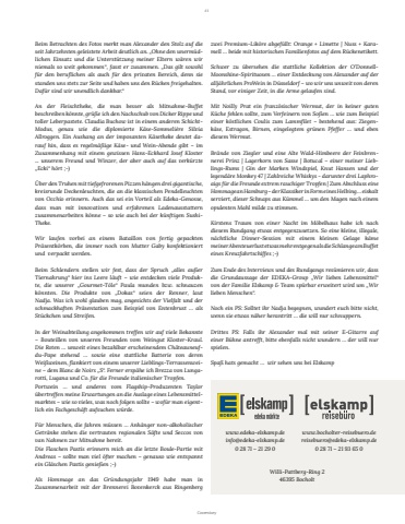 zwei Premium-Lik%u00f6re abgef%u00fcllt: Orange + Limette | Nuss + Karamell %u2026 beide mit historischen Familienfotos auf dem R%u00fcckenetikett. Schwer zu %u00fcbersehen die stattliche Kollektion der O%u2019DonnellMoonshine-Spirituosen %u2026 einer Entdeckung von Alexander auf der allj%u00e4hrlichen ProWein in D%u00fcsseldorf %u2013 wo wir uns unweit von deren Stand, vor einiger Zeit, in die Arme gelaufen sind. Mit Noilly Prat ein franz%u00f6sischer Wermut, der in keiner guten K%u00fcche fehlen sollte, zum Verfeinern von So%u00dfen %u2026 wie zum Beispiel einer k%u00f6stlichen Coulis zum Lammfilet %u2013 bestehend aus: Ziegenk%u00e4se, Estragon, Birnen, eingelegtem gr%u00fcnen Pfeffer %u2026 und ebendiesem Wermut. Br%u00e4nde von Ziegler und eine Alte Wald-Himbeere der Feinbrennerei Prinz | Lagerkorn von Sasse | Botucal %u2013 einer meiner Lieblings-Rums | Gin der Marken Windspiel, Knut Hansen und der legend%u00e4re Monkey 47 | Zahlreiche Whiskys - darunter drei Laphroaigs f%u00fcr die Freunde extrem rauchiger Tropfen | Zum Abschluss eine Hommage an Hamburg %u2013 der Klassiker in Form eines Helbing %u2026 eiskalt serviert, dieser Schnaps aus K%u00fcmmel %u2026 um den Magen nach einem opulenten Mahl milde zu stimmen. Kirstens Traum von einer Nacht im M%u00f6belhaus habe ich nach diesem Rundgang etwas entgegenzusetzen. So eine kleine, illegale,n%u00e4chtliche Dinner-Session mit einem kleinen Gelage k%u00e4me meiner Abenteuerlust etwas mehr entgegen als die Schlange am Buffet eines Kreuzfahrtschiffes ;-) Zum Ende des Interviews und des Rundgangs res%u00fcmieren wir, dass die Grundaussage der EDEKA-Group %u201eWir lieben Lebensmittel%u201c von der Familie Elskamp & Team sp%u00fcrbar erweitert wird um %u201eWir lieben Menschen%u201c. Noch ein PS: Solltet ihr Nadja begegnen, wundert euch bitte nicht, wenn sie etwas n%u00e4her herantritt %u2026 die will nur schnuppern. Drittes PS: Falls ihr Alexander mal mit seiner E-Gitarre auf einer B%u00fchne antrefft, bitte ebenfalls nicht wundern %u2026 der will nur spielen.Spa%u00df hats gemacht %u2026 wir sehen uns bei Elskamp Beim Betrachten des Fotos merkt man Alexander den Stolz auf die seit Jahrzehnten geleistete Arbeit deutlich an. %u201eOhne den unerm%u00fcdlichen Einsatz und die Unterst%u00fctzung meiner Eltern w%u00e4ren wir niemals so weit gekommen%u201c, fasst er zusammen. %u201eDas gilt sowohl f%u00fcr den beruflichen als auch f%u00fcr den privaten Bereich, denn sie standen uns stets zur Seite und haben uns den R%u00fccken freigehalten. Daf%u00fcr sind wir unendlich dankbar.%u201cAn der Fleischtheke, die man besser als Mitnahme-Buffet beschreiben k%u00f6nnte, gr%u00fc%u00dfe ich den Nachschub von Dicker Rippe und toller Leberpastete. Claudia Buchow ist in einem anderen SchichtModus, genau wie die diplomierte K%u00e4se-Sommeli%u00e8re Silvia Allroggen. Ein Aushang an der imposanten K%u00e4setheke deutet darauf hin, dass es regelm%u00e4%u00dfige K%u00e4se- und Wein-Abende gibt %u2013 im Zusammenhang mit einem gewissen Hans-Eckhard Josef Kloster ... unserem Freund und Winzer, der aber auch auf das verk%u00fcrzte %u201eEcki%u201c h%u00f6rt ;-)%u00dcber den Truhen mit tiefgefrorenen Pizzen h%u00e4ngen drei gigantische, kreisrunde Deckenleuchten, die an die klassischen Pendelleuchten von Occhio erinnern. Auch das sei ein Vorteil als Edeka-Genosse,dass man mit innovativen und erfahrenen Ladenausstattern zusammenarbeiten k%u00f6nne %u2013 so wie auch bei der k%u00fcnftigen SushiTheke. Wir laufen vorbei an einem Bataillon von fertig gepackten Pr%u00e4sentk%u00f6rben, die immer noch von Mutter Gaby konfektioniert und verpackt werden. Beim Schlendern stellen wir fest, dass der Spruch %u201ealles au%u00dfer Tiernahrung%u201c hier ins Leere l%u00e4uft %u2013 wie entdecken viele Produkte, die unserer %u201eGourmet-T%u00f6le%u201c Paula munden bzw. schnauzen k%u00f6nnten. Die Produkte von %u201eDokas%u201c seien der Renner, laut Nadja. Was ich wohl glauben mag, angesichts der Vielfalt und der schmackhaften Pr%u00e4sentation zum Beispiel von Entenbrust %u2026 als St%u00fcckchen und Streifen. In der Weinabteilung angekommen treffen wir auf viele Bekannte%u2013 Bouteillen von unseren Freunden vom Weingut Kloster-Kraul. Die Roten %u2026 unweit eines bezahlbar erscheinendem Ch%u00e2teauneufdu-Pape stehend %u2026 sowie eine stattliche Batterie von deren Wei%u00dfweinen, flankiert von einem unserer Lieblings-Terrassenweine %u2013 dem Blanc de Noirs %u201eS%u201c. Ferner ersp%u00e4he ich Brezza von Lungarotti, Lugana und Co. f%u00fcr die Freunde italienischer Tropfen. Portwein %u2026 und anderes vom Flagship-Produzenten Taylor %u00fcbertreffen meine Erwartungen an die Auslage eines Lebensmittelmarktes %u2013 wie so vieles, was noch folgen sollte %u2013 wof%u00fcr man eigentlich ein Fachgesch%u00e4ft aufsuchen w%u00fcrde. F%u00fcr Menschen, die fahren m%u00fcssen %u2026 Anh%u00e4nger non-alkoholischer Getr%u00e4nke stehen die vertrauten regionalen S%u00e4fte und Seccos von van Nahmen zur Mitnahme bereit. Die Flaschen Pastis erinnern mich an die letzte Boule-Partie mit Andreas %u2013 sollte man viel %u00f6fter machen %u2013 genauso wie entspannt ein Gl%u00e4schen Pastis genie%u00dfen ;-)Als Hommage an das Gr%u00fcndungsjahr 1949 habe man in Zusammenarbeit mit der Brennerei Bovenkerck aus Ringenberg www.edeka-elskamp.deinfo@edeka-elskamp.de 0 28 71 %u2013 21 29 0www.bocholter-reisebuero.dereisebuero@edeka-elskamp.de0 28 71 %u2013 21 93 65 0Willi-Pattberg-Ring 246395 Bocholt41Coverstory