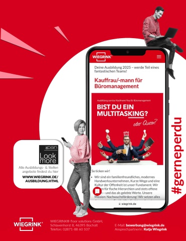 WWW.WIEGRINK.DE/AUSBILDUNG.HTMLAlle Ausbildungs- & Stellenangebote fi ndest du hierWIEGRINK%u00ae fl oor soluti ons GmbH, Schlavenhorst 8, 46395 BocholtTelefon: 02871-88 60 107E-Mail: bewerbung@wiegrink.deAnsprechpartnerin: Katja Wiegrink#gerneperdu