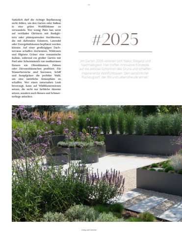 Nat%u00fcrlich darf die richtige Bepflanzung nicht fehlen, um den Garten oder Balkonin eine gr%u00fcne Wohlf%u00fchloase zu verwandeln. Wer wenig Platz hat, setzt auf vertikales G%u00e4rtnern mit Rankgittern oder platzsparenden Hochbeeten, die mit duftenden Kr%u00e4utern, Lavendeloder Zwergobstb%u00e4umen bepflanzt werdenk%u00f6nnen. Auf einer gro%u00dfz%u00fcgigen Dachterrasse schaffen Hortensien, Wildrosenund filigrane Gr%u00e4ser eine romantischeKulisse, w%u00e4hrend ein gro%u00dfer Garten mit Pool oder Schwimmteich von mediterranen flanzen wie Olivenb%u00e4umen, Palmenoder Zitronenb%u00e4umchen profitiert. F%u00fcr Wasserbereiche sind Seerosen, Schilf und Sumpfgr%u00e4ser die perfekte Wahl, um eine nat%u00fcrliche Atmosph%u00e4re zu schaffen. Wer einen naturnahen Look bevorzugt, kann auf Wildblumenwiesensetzen, die nicht nur farbliche Akzente setzen, sondern auch Bienen und Schmetterlinge anlocken.%u201eIm Garten 2025 vereinen sich Natur, Eleganz und Nachhaltigkeit. Hier treffen innovative Konzepte auf die zeitlose Sch%u00f6nheit des Gr%u00fcns und schaffen inspirierende Wohlf%u00fchloasen. Dein pers%u00f6nlicher R%u00fcckzugsort, der Stil und Lebensfreude atmet.%u201c#202550Living and Lifestlye