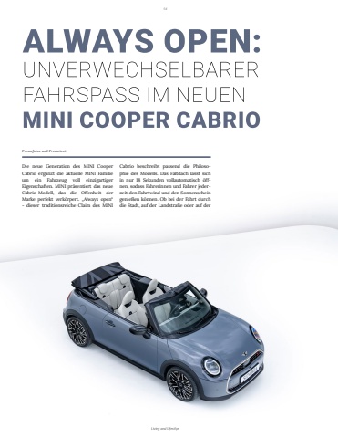 Die neue Generation des MINI Cooper Cabrio erg%u00e4nzt die aktuelle MINI Familieum ein Fahrzeug voll einzigartiger Eigenschaften. MINI pr%u00e4sentiert das neue Cabrio-Modell, das die Offenheit der Marke perfekt verk%u00f6rpert. %u201eAlways open%u201c - dieser traditionsreiche Claim des MINI Cabrio beschreibt passend die Philosophie des Modells. Das Faltdach l%u00e4sst sich in nur 18 Sekunden vollautomatisch %u00f6ffnen, sodass Fahrerinnen und Fahrer jederzeit den Fahrtwind und den Sonnenschein genie%u00dfen k%u00f6nnen. Ob bei der Fahrt durch die Stadt, auf der Landstra%u00dfe oder auf der Pressefotos und Pressetext 54Living and Lifestlye