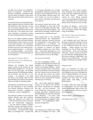Sum S%u00e4fte und Aromen aus Gefl%u00fcgelkarkassen zu extrahieren %u2013 perfekt f%u00fcr eine intensive, reichhaltige, aromatische So%u00dfe. Um eine solche zu erhalten, werden diese S%u00e4fte dann mit Wein, Br%u00fche und Gew%u00fcrzen reduziert. Die Preise f%u00fcr diese raren Kultsymbole analoger Kochkunst variieren zwischen 6.000 und 15.000 Euro. Eher nicht das, was man sich als Souvenir einpacken l%u00e4sst %u2013 nicht mal, wenn man kulinarisch extrem einen an der M%u00fctze hat ;-) Ein solches Teil zu Lebzeiten amortisiert zu bekommen, scheint f%u00fcr einen Privathaushalt eher unrealistisch. Bevor ihr auf falsche Gedanken kommt, die Karkassen werden auf keinem Fall dem K%u00fcchenh%u00e4cksler, dessen Namen wir nicht in dem Mund nehmen, zum Schreddern vorgeworfen. Wir haben vor ca. zehn Jahrendie kleine Schwester einer solchen Entenpresse ergattern k%u00f6nnen %u2013 ca. 200 Jahre alt %u2026 durchaus bezahlbar %u2026 und noch besser f%u00fcr die kleineren Wachteln geeignet als eine Entenpresse. Sonntag, 02. Februar 2025 | Wachtel-Lunch | Die Verm%u00e4hlung von Food & Wine W%u00e4hrend die Gemahlin eine Runde yogiert, bereite ich die Szenerie f%u00fcr das Schmackofatz-Spektakel vor %u2013 das Mise enPlace, wie die Profis sagen. Die Wachteln stammen aus der TK-Abteilung des Handelshofs in Bocholt. Die sind dort zu viert verpackt %u2013 wir bef%u00f6rdern in der Regel drei davon in den Wagen, damit sich der Aufwand lohnt und wir auch in den n%u00e4chsten Tagen noch Spa%u00df am Gekochten haben. Schenkelchen und Br%u00fcstchen sind ausgel%u00f6st und schlummern in einer Marinade von Oliven%u00f6l, Knoblauch, Rosmarin und s%u00fc%u00dfem Sherry. Die Pasta %u2026 Spaghetti von La Molisana %u2013 unserer Lieblingssorte. Die Karkassen wandern in einen Topf mit hei%u00dfem Oliven%u00f6l. Nach dem Anbratenerfolgt das Abl%u00f6schen mit Noilly Prat %u2013 einem franz%u00f6sischen Wermut. Das Ganzewird mit Gem%u00fcsebr%u00fche aufgegossen %u2026 und mit frischen Kr%u00e4utern (Lorbeer, Rosmarin, Thymian und Salbei) zum Simmern gebracht. Mit dem richtigen Kochwein im Glase %u2026 zum Beispiel dem %u201eVillage Blanc%u201c vom Weingut PAN %u2026 vergehen die ca. 45 Minuten Reduktion wie im Fluge. Anschlie%u00dfend erfolgt das Auspressen der Karkassen mit dem legend%u00e4ren Ger%u00e4t, das ihr auf den Bildern erkennen k%u00f6nnt. Der erste Tropfen, der aus dem Ausguss in einen kleinen Topf flie%u00dft, wird mit einem Prost salutiert. Der intensive Extrakt wird mit der reduzierten Fl%u00fcssigkeit aus dem Topf vereint und mit ein wenig Sahne und Butter angereichert und in eine Pfanne gegeben %u2013 das ideale Bad f%u00fcr die Beilage, worauf wir gleich zu sprechen bzw. schreiben kommen. Doch zun%u00e4chst gilt es, den wartenden Wachtel-Br%u00fcstchen und -Schenkelchen das Finale zu g%u00f6nnen. Zun%u00e4chst br%u00e4t man die Schenkelchen in einer gro%u00dfen Pfannen goldbraun an %u2026 ca. 15 Minuten %u2026 um sie dann in einen auf 100 Grad vorgeheizten Backofen zu schieben. Die gleiche Behandlung erfahren die zarten Br%u00fcstchen %u2026 sie brauchen allerdings nur ca. 10 Minuten. W%u00e4hrend beides im Backofen gar zieht, k%u00fcmmern wir uns um die Beilage. Die passende Beilage Die kann mannigfaltig ausfallen .%u2026 ein herzhafter Kartoffelstampf, ein Risotto mit Steinpilzen etc. Wir hingegen teilen die Passion von Theobald Pfaffmann %u2013 sprich, eine gute Pasta geht immer. Diese Kombination aus den feinen Aromen der Wachtel und einer leichten Pasta ist einfach k%u00f6stlich. Das gibt dem Gericht eine sch%u00f6ne Balance. Wenn ihr die Pasta schlicht haltet, kommt der feine Geschmack der Wachtel besonders gut zur Geltung. Also %u2026 die al dente gekochten Spaghetti geben wir ins Bad mit dem Wachtelsud, dessen Geschmack sie aufsaugen. Wer mag %u2026 mit etwas Parmesan %u2026 evtl. etwas Tr%u00fcffel-Paste. Darauf setzen wir die knusprig gebratenen Wachtelbr%u00fcstchen und Schenkelchen aus dem Ofen. Ansonstenkeine Ablenkung %u2013 nur Pasta, purer Fleischgeschmack und %u2026 nicht zu vergessen der gut gek%u00fchlte, vinologische Hauptdarsteller %u2013 der Wei%u00dfburgunder Kaiserberg vom Weingut PAN. Das Fazit Der Geschmack der Wachtel, die samtigeSo%u00dfe, die Leichtigkeit der Pasta %u2013 alles verschmolz zu einer kleinen kulinarischen Symphonie. Kein lautes Spektakel, sondern eine stille, tiefgehende Harmonie. Kein lautes Gericht %u2026 sondern eins, welches die zarten Kl%u00e4nge anstimmt %u2013 mit einem herausragenden Dirigenten im Glase. Letztendlich war er es, der uns dazu brachte, dieses Gericht mit euch zu teilen. Ein Bissen, ein Schluck %u2026 und die Zeit scheint stehen zu bleiben. Der perfekte Wein. Die perfekte Wachtel. Eine Begegnung, die nachklingt.Der Plan B | Falls mal keine Wachteln zu bekommen sind %u2026 oder Wachteln nicht euer Ding sind. Ihr kennt sicherlich den Klassiker Coq auf vin (Rotweinh%u00e4hnchen). Das gibt es auch in einer Wei%u00dfwein-Variante als %u201eCoq au Riesling%u201c %u2026 einfach googeln. Ich werdedemn%u00e4chst ein Coq au Pinot Blanc f%u00fcr uns brutscheln %u2026 nicht, weil ich Riesling nicht mag %u2026 sondern, weil ich so fasziniert von den PAN%u2019schen Wei%u00dfburgundern bin. Den schon erw%u00e4hnten %u201eVillage Blanc%u201c zum Kochen und als K%u00fcchenwein %u2026 und den besagten %u201eKaiserberg%u201c zum fertigen Gericht. Begegnungen Neben der Faszination zur Figur und Philosophie des PAN, der Passion f%u00fcr Wein und Food gibt es eine weitere Parallele zum Senior Theobald Pfaffmann: Bei unseremersten pers%u00f6nlichen Kennenlernen, dem Ansto%u00dfen mit einem Wein zur Vespersprach dieser: %u201eZum Wohl %u2013 auf die BEGEGNUNG.%u201c Es konnte einfach kein Zufall sein, dass wir uns begegnen. Wir sind sicher, dass weitere Begegnungen folgen werden, mit der Familie Pfaffmann und ihren Weinen vom Weingut PAN. In diesem Sinne %u2026 auf die Begegnung %u2026 euer Kitchen-Story-Team61Kulinarik