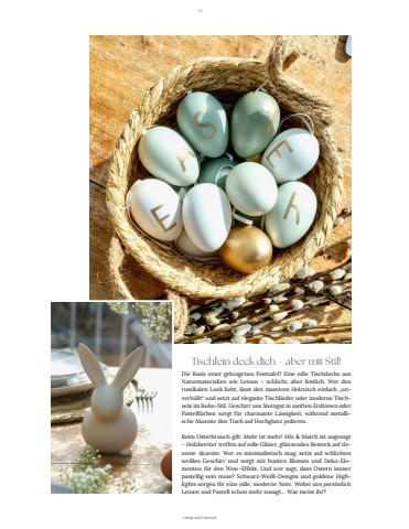 Tischlein deck dich %u2013 aber mit Stil!Die Basis einer gelungenen Festtafel? Eine edle Tischdecke aus Naturmaterialien wie Leinen %u2013 schlicht, aber festlich. Wer den rustikalen Look liebt, l%u00e4sst den massiven Holztisch einfach %u201eunverh%u00fcllt%u201c und setzt auf elegante Tischl%u00e4ufer oder moderne Tischsets im Boho-Stil. Geschirr aus Steingut in sanften Erdt%u00f6nen oder Pastellfarben sorgt f%u00fcr charmante L%u00e4ssigkeit, w%u00e4hrend metallische Akzente den Tisch auf Hochglanz polieren.Beim Osterbrunch gilt: Mehr ist mehr! Mix & Match ist angesagt %u2013 Holzbretter treffen auf edle Gl%u00e4ser, gl%u00e4nzendes Besteck auf dezente Akzente. Wer es minimalistisch mag, setzt auf schlichtes wei%u00dfes Geschirr und sorgt mit bunten Blumen und Deko-Elementen f%u00fcr den Wow-Effekt. Und wer sagt, dass Ostern immer pastellig sein muss? Schwarz-Wei%u00df-Designs und goldene Highlights sorgen f%u00fcr eine edle, moderne Note. Wobei uns pers%u00f6nlich Leinen und Pastell schon mehr zusagt%u2026 Was meint ihr?70Living and Lifestyle
