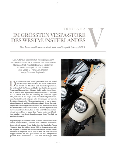 Das Autohaus Boomers hat im vergangen Jahr ein exklusives Fenster in die Welt des italienischen Flairs ge%u00f6ffnet. Nun l%u00e4dt Boomers wiederholt zu einem unvergleichlichen Erlebnis,dem Vespa & Friends, im gr%u00f6%u00dften Vespa-Store der Region ein. Der Schauraum des Stores pr%u00e4sentiert sich als wahre Oase f%u00fcr Vespa-Enthusiasten, mit einer eindrucksvollen Vielfalt an Modellen und Ausstattungsvarianten. Die Leidenschaft f%u00fcr Vespas und Roller durchzieht das gesamte Team, angef%u00fchrt vom Store-Manager Andr%u00e9 L%u00fccke, einem Experten in Technik und begeisterten Vespa-Liebhaber. Er lebt Vespa %u2013 er hats im Blut! Seit der Er%u00f6ffnung des Stores im August 2023, verzeichnet der Vespa-Store eine %u00fcberw%u00e4ltigende Resonanz. Tats%u00e4chlich und entgegen aller Erwartungen war auch in den kalten Monaten, im Winter gut zu tun und es waren immer wieder Kunden da und haben Mopeds gekauft. Diese Entwicklung hat auch den Piaggio-Deutschland-Chef Massimiliano Gerbi bei seinem Besuch total beeindruckt. Er war so begeistert vom Showroom und vom Team, dass er Foto- und Videomaterial angefragt hat, welches er dann %u00fcber Piaggio weiter ver%u00f6ffentlichen m%u00f6chte %u2013 was f%u00fcr ein Kompliment zum Dolce-Vita-Flair im Autohaus Boomers!Im gro%u00dfz%u00fcgigen Schauraum finden sich aber nicht nur die klassischen Vespa-Modelle, sondern auch exklusive Sondereditionen wie die neuste Vespa Snake. Von der klassischer Vespa Primavera %u00fcber die gr%u00f6%u00dfere Vespa GTS zu Besonderheiten wie die Vespa GTV 310 oder die limitierten Modelle, ist der Premium-Store 1a aufgestellt. Nicht zuletzt seien die verschiedenen Piaggio-Modelle, als sehr gute Roller f%u00fcr den Alltagsbetriebgenannt. Vom elektrischen 1 + bis zum dreir%u00e4drigen MP3 Das Autohaus Boomers feiert in Ahaus Vespa & Friends 2025.IM GR%u00d6SSTEN VESPA-STORE DES WESTM%u00dcNSTERLANDES DOLCE VITA75Portrait