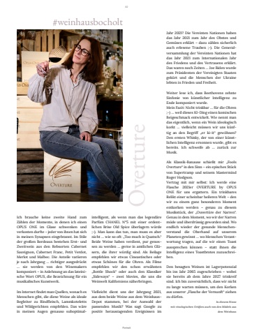 Ich brauche keine zweite Hand zum Z%u00e4hlen der Momente, in denen ich einen OPUS ONE im Glase schwenken und verkosten durfte %u2013 jeder von ihnen hat sich in meinen Synapsen eingebrannt. Im Stile der gro%u00dfen Bordeaux bestehen Erst- und Zweitwein aus den Rebsorten Cabernet Sauvignon, Cabernet Franc, Petit Verdot, Merlot und Malbec. Die Anteile variierenje nach Jahrgang %u2026 richtiger ausgedr%u00fcckt %u2026 sie werden von den Winemakern komponiert %u2013 in Anlehnung an das lateinische Wort OPUS, die Bezeichnung f%u00fcr ein musikalisches Kunstwerk.Im Internet findet man Quellen, wonach es Menschen gibt, die diese Weine als ideale Begleiter zu Rindfleisch, Lammkoteletts und Wildgerichten empfehlen. Das w%u00e4re in meinen Augen genauso suboptimalintelligent, als wenn man das legend%u00e4re Parf%u00fcm CHANEL N%u00b05 mit einer ordentlichen Brise Old Spice %u00fcberlagern w%u00fcrde ;-). Man kann das tun, man muss es aber nicht %u2026 wie so oft: %u201eToo much is Quatsch.%u201c Beide Weine haben verdient, pur genossen zu werden %u2026 gerne in amtlichen Gl%u00e4sern, die ihrer w%u00fcrdig sind. Als Beilage empfehlen wir etwas Cineastisches oder etwas Sch%u00f6nes f%u00fcr die Ohren. Als Filme empfehlen wir den schon erw%u00e4hnten %u201eBottle Shock%u201c oder auch den Klassiker %u201eSideways%u201c %u2013 zwei Movies, die uns die Weinwelt Kaliforniens n%u00e4herbringen.Vielleicht dient uns der Jahrgang 2021, aus dem beide Weine aus dem WeinhausDepot stammen, bei der Auswahl der passenden Musik? Was sagt Google zu positiv herausragenden Ereignissen im Jahr 2021? Die Vereinten Nationen haben das Jahr 2021 zum Jahr des Obstes und Gem%u00fcses erkl%u00e4rt %u2013 dazu z%u00e4hlen sicherlich auch erlesene Trauben ;-). Die Generalversammlung der Vereinten Nationen hat das Jahr 2021 zum Internationalen Jahr des Friedens und des Vertrauens erkl%u00e4rt. Das waren noch Zeiten %u2026 Joe Biden wurdezum Pr%u00e4sidenten der Vereinigten Staaten gek%u00fcrt und die Menschen der Ukraine lebten in Frieden und Freiheit.Weiter lese ich, dass Beethovens zehnteSinfonie von k%u00fcnstlicher Intelligenz zu Ende komponiert wurde.Mein Fazit: Nicht trinkbar %u2026 f%u00fcr die Ohren ;-) %u2026 weil dieses KI-Ding einen komischen Beigeschmack entwickelt. Wie nennt man das eigentlich, wenn ein Wein ideologisch korkt %u2026 vielleicht m%u00fcssen wir uns k%u00fcnftig an den Begriff %u201eer ki-it%u201c gew%u00f6hnen? Den ersten Whisky, der von einer k%u00fcnstlichen Intelligenz ersonnen wurde, gibt es bereits. Ich schweife ab %u2026 zur%u00fcck zur Musik.Als Klassik-Banause schie%u00dft mir %u201eFools Overture%u201c in den Sinn %u2013 ein episches St%u00fcck von Supertramp und seinem Mastermind Roger Hodgson. Vertrag mit mir selbst: Ich werde eine Flasche 2021er OVERTURE by OPUS ONE f%u00fcr uns ergattern. Ein trinkbares Relikt einer scheinbar heileren Welt %u2013 den wir zu einem ganz besonderen Moment entkorken werden %u2013 genau zu diesem Musikst%u00fcck, der %u201eOuvert%u00fcre der Narren%u201c. Genau in dem Moment, wo wir der Narren m%u00fcde und %u00fcberdr%u00fcssig geworden sind. Wo endlich wieder der gesunde Menschenverstand die Oberhand auf unserem Planeten gewinnt %u2026 wo Menschen Verantwortung tragen, auf die wir einen Toast aussprechen k%u00f6nnen %u2013 statt ihnen die Intelligenz eines Toastbrotes zuzuschreiben.Den besagten Weinen ist Lagerpotenzial bis ins Jahr 2065 zugeschrieben %u2013 wobei sie bereits ab dem Jahre 2027 trinkreif sind. Ich bin zuversichtlich, dass wir nicht zu lange warten m%u00fcssen, um den Korken aus unserer %u201eFlasche der Vernunft%u201c ziehen zu d%u00fcrfen.In diesem Sinnemit vinologischen Gr%u00fc%u00dfen auch von den M%u00e4dels aus dem WeinhausOverture#weinhausbocholt82Portrait
