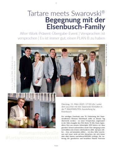 Dienstag, 11. M%u00e4rz 2025 | 17.00 Uhr | unter dem Leuchter mit den Swarovski-Kristallen in der T-RAUMWELTEN-Ausstellung by ElsenbuschEin w%u00fcrdiges Geschenk zum 70. Geburtstag des Stammes%u00e4ltesten Klemens Elsenbusch sollte an diesem Tag %u00fcberreicht werden %u2013 so unser Versprechen, angeteasert in der M%u00e4rz-Ausgabe des PAN (Seite 70%u201383). Einen legend%u00e4ren Port aus seinem Geburtsjahr 1955 hatten wir dazu geordert. Schwer aufzutreiben, da der 55er-Jahrgang zu den wertvollsten des letzten Jahrhunderts z%u00e4hlt. Apropos z%u00e4hlen %u2026 bzw. auf jemanden z%u00e4hlen %u2026 tut dies, liebe Leserinnen und Leser, nicht auf den Menschen, der sich hinter dem eBay-Namen saschaheuer11052012 verbirgt. Die Lieferung der georderten und bezahlten Flasche Portwein Tartare meets Swarovski%u00ae Begegnung mit der Elsenbusch-FamilyAfter-Work-Pr%u00e4sent-%u00dcbergabe-Event | Versprochen ist versprochen | Es ist immer gut, einen PLAN B zu habenv. l. n. r. Daniel & Melli, Christian & Luca, Elisabeth und Klemens Elsenbusch #familyshooting#diamantenf%u00fcralle#tartaremeetsswarovskiFoto: Kirsten Bu%u00df // Text: Roland Bu%u00df Advertorial84Portrait
