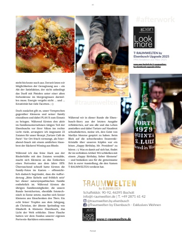 steht bis heute noch aus. Derzeit loten wir M%u00f6glichkeiten der Genugtuung aus %u2013 ein Akt der Satisfaktion, der nicht unbedingt das Duell mit Pistolen unter einer alten Eichenkrone im Morgengrauen darstellen muss. Energie vergeht nicht %u2026 und %u2026 Kreativit%u00e4t hat viele Facetten. ;-)Doch zun%u00e4chst gilt es, unser Versprechen gegen%u00fcber Klemens und seiner Family einzul%u00f6sen und dabei PLAN B zum Einsatz zu bringen. W%u00e4hrend Kirsten den aktiv im Familienunternehmen t%u00e4tigen Teil der Elsenbuschs vor ihrer Nikon ins rechte Licht r%u00fcckt, arrangiere ich insgesamt 23 Zutaten f%u00fcr unser Rezept %u201eTartare Caf%u00e9 de Paris%u201c. Vor Ort frisch vermengt, als Feierabend-Snack mit einem amtlichen Hausbrot der B%u00e4ckerei Wissing aus Rhede.W%u00e4hrend ich das feine Hack aus der Rinderh%u00fcfte mit den Zutaten verm%u00e4hle,macht sich Klemens an das Entkorkeneines Portweins aus dem Jahre 1979. %u00dcberraschend schnell hatte Kirsten die Family-Fotos im Kasten %u2013 offensichtlich dadurch begr%u00fcndet, dass die Aufforderung %u201eBitte l%u00e4cheln und fr%u00f6hlich sein%u201c bei dieser natursympathischen Familie entbehrlich ist. W%u00e4hrend Kirsten die %u00fcbrigen Familienmitglieder, die unsere Runde bereicherten, ebenfalls fototechnisch in Szene setzte, machte sich Senior Klemens ans Einschenken des 79ers. Ein echt feiner Tropfen aus dem Jahrgang, als Christian, der %u00e4lteste Spr%u00f6ssling von Elisabeth & Klemens Elsenbusch, das Licht der Welt erblickte. Diese Flasche hatten wir dem Fundus unserer eigenen Portwein-Rarit%u00e4ten entnommen.W%u00e4hrend wir in dieser Runde die Elsenbusch-Story aus der letzten Ausgabe reflektierten, auf uns alle und das Leben anstie%u00dfen und dabei Tartare auf Hausbrot schnabulierten, meine ich, den Geist von Marilyn Monroe gesp%u00fcrt zu haben. Beim Blick auf die schwebenden SwarovskiKristalle %u00fcber unseren K%u00f6pfen war ein leises %u201eHappy Birthday, Mr. President%u201c zu h%u00f6ren ;-). Was es damit auf sich hat, findet ihr im verlinkten Artikel. Wir schlie%u00dfen mit einem %u201eHappy Birthday, lieber Klemens%u201c %u2013 und bedanken uns f%u00fcr die gemeinsame Zeit in eurer Ausstellung, die den Namen T-RAUMWELTEN verdient hat.Schaffeldstr. 90-92, 46395 Bocholtinfo@t-raumwelten.de %u0335 T. +49 2871 61 42 @traumwelten.by.elsenbusch @Traumwelten by Elsenbusch - Exklusives Wohnenwww.t-raumwelten.deT-RAUMWELTEN by Elsenbusch Upgrade 2025 PAN Redaktion aus M%u00e4rz 2025 www.pan-bocholt.de/t-raumweltenby-elsenbusch-upgrade-2025/#traumwelten#afterwork85Portrait