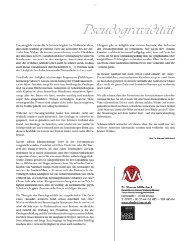 Dr. Simone M%u00f6llenbeckZusatzbezeichnung ZahnheilkundeZusatzbezeichnung HeimtiereHovesath 7 %u00b7 46414 Rhede T. 02872 - 80 33 44 I M. 0151 - 569 643 64www.rhede-tierarzt.deUrspr%u00fcnglich diente die Scheintr%u00e4chtigkeit im Wolfsrudel dazu, dass nicht tr%u00e4chtig gewordene Tiere die Leitw%u00f6lfin bei der Aufzucht ihrer Welpen als Ammen unterst%u00fctzten, um das %u00dcberleben des Rudels zu sichern. Nat%u00fcrlich ist diese Veranlagung bei unserenHaushunden nur noch in den wenigsten Ausnahmen sinnvoll, aber die Evolution schreitet eben nicht so schnell voran, so dass auch kleine Hunderassen durchschnittlich 6 %u2013 8 Wochen nach der L%u00e4ufigkeit durch das hormonelle Tohuwabohu irritiert sind. Zum Ende der L%u00e4ufigkeit wird weniger Progesteron (Gelbk%u00f6rperhormon) produziert, was zu einem Anstieg der Prolaktinkonzentration f%u00fchrt. Prolaktin sorgt f%u00fcr eine Anschwellung des Ges%u00e4uges und f%u00fcr einen Milcheinschuss. Au%u00dferdem ist Scheintr%u00e4chtigsein auch Kopfsache, denn betroffene H%u00fcndinnen adoptieren Spielzeuge aller Art, bauen ein Nest, werden unruhig und m%u00f6chten sogar ihre eingebildeten Welpen verteidigen. Manche Tiere verweigern das Fressen und m%u00f6gen nicht mehr Spazierengehen, da die Muttergef%u00fchle den Alltag bestimmen. W%u00e4hrend der Pseudogravidit%u00e4t leidet ihre H%u00fcndin nicht nur seelisch, sondern auch k%u00f6rperlich. Das Ges%u00e4uge ist teilweise so gespannt, dass es geradezu weh tut. Der Schmerz verleitet den Hund, das Ges%u00e4uge zu belecken, was wiederum zur weiteren Milchproduktion und eventuell auch zu Entz%u00fcndungen f%u00fchrt. Aus diesem Teufelskreis kommt der Patient leider nicht mehr alleine heraus. Darum sollten scheintr%u00e4chtige Tiere in der Tierarztpraxis vorgestellt werden. Zun%u00e4chst wird Ihre Tier%u00e4rztin oder Ihr Tierarzt mit Ihnen er%u00f6rtern, ob eine echte Tr%u00e4chtigkeit vorliegt. Bedenken Sie in dieser Diskussion, dass Ihre H%u00fcndin wirklich nur tragend sein kann, wenn Sie von einem R%u00fcden vollst%u00e4ndig gedeckt wurde. Hierzu geh%u00f6rt ein H%u00e4ngenbleiben bei der Kopulation, was bis zu 20 Minuten und l%u00e4nger andauern kann. Ein schnelles Dr%u00fcberh%u00fcpfen von Nachbars Lumpi reicht nicht aus, um schwanger zu werden. In Zweifelsf%u00e4llen, z. B. wenn sich die Patientin in der vorhergehenden L%u00e4ufigkeit f%u00fcr ein Sch%u00e4ferst%u00fcndchen von Ihnen entfernt hat, ist es sinnvoll, mit bildgebenden Verfahren wie einer Ultraschall- oder einer R%u00f6ntgenuntersuchung eine echte Tr%u00e4chtigkeit auszuschlie%u00dfen. Das ist wichtig, da Medikamente gegen Scheintr%u00e4chtigkeit die eventuelle Frucht sch%u00e4digen k%u00f6nnen. Die Therapie der Pseudogravidit%u00e4t ist unspektakul%u00e4r. Die Gabe eines Prolaktin-Hemmers f%u00fchrt schon innerhalb von einer Woche zur deutlichen Besserung der Symptome. Das Arzneimittelwird als Saft oder in Tablettenform vom Besitzer verabreicht und hemmt die Wirkung des Prolaktins, welches ja f%u00fcr die Ges%u00e4ugeanbildung und die Verhaltens%u00e4nderung verantwortlich ist. Dar%u00fcber hinaus k%u00f6nnen Sie die imagin%u00e4ren Welpen entfernen, das Nest abbauen und lange Spazierg%u00e4nge im beginnenden Fr%u00fchling machen, denn Scheintr%u00e4chtigkeit ist eben auch Kopfsache. %u00dcbrigens gibt es lediglich eine sichere Methode, das Auftreten der Pseudogravidit%u00e4t zu verhindern. Nur wenn Ihre H%u00fcndin kastriert und damit hormonell stillgelegt wird, kann auf Dauer bei Tieren, die f%u00fcr diese Erkrankung anf%u00e4llig sind, die Symptomatik einer eingebildeten Tr%u00e4chtigkeit verhindert werden. %u00dcber die Vor- und Nachteile einer Kastration informiert Sie Ihre Tier%u00e4rztin oder Ihr Tierarzt gerne. In meiner Kindheit hat mein erster Hund %u201eRaudi%u201c, ein PudelDackel-M%u00e4dchen, zwei verlassene K%u00e4tzchen adoptiert und ihnen so das Leben gerettet. In diesem Fall hatte das hormonelle Chaos doch noch ein gutes Ende und Prolaktin-Hemmer gab es damals noch nicht %u2026 Wir alle wissen, dass der Fortschritt der Medizin immer schneller voranschreitet. So ist es auch mit allerhand Arzneimitteln in der Veterin%u00e4rmedizin. Da wir nach diesem milden Winter mit einem parasit%u00e4ren Hoch rechnen, will ich Sie in meinem n%u00e4chsten Artikel %u201eMai! Was tun, damit die Fl%u00f6he nicht auf dem Tisch tanzen?!%u201c %u00fcber die Neuerungen auf dem Sektor Floh- und Zeckenbek%u00e4mpfung informieren. Schlussendlich w%u00fcnsche ich Ihnen, dass Sie im April nur mit sch%u00f6nen Scherzen %u00fcberrascht werden und verbleibe mit den besten Gr%u00fc%u00dfen.Ihre Dr. Simone M%u00f6llenbeckPseudogravidit%u00e4t87