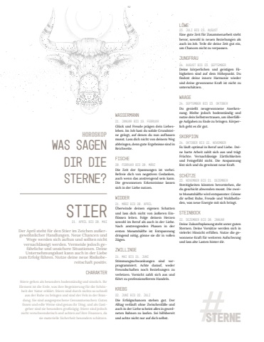 L%u00f6we23. Juli bis 23. AugustEine gute Zeit f%u00fcr Zusammenarbeit steht bevor, sowohl in neuen Beziehungen als auch im Job. Teile dir deine Zeit gut ein, um Chancen nicht zu verpassen.Jungfrau24. August bis 23. SeptemberDeine k%u00f6rperlichen und geistigen F%u00e4higkeiten sind auf dem H%u00f6hepunkt. Du fi ndest deine innere Harmonie wieder und deine gewonnene Kraft ist nicht zu untersch%u00e4tzen.Waage 24. September bis 23. OktoberDu genie%u00dft neugewonnene Anerkennung. Bleibe jedoch bodenst%u00e4ndig und nutze dein Selbstvertrauen, um %u00fcberf%u00e4llige Aufgaben zu Ende zu bringen. K%u00f6rperlich geht es dir gut.Skorpion 24. Oktober bis 22. NovemberEs l%u00e4uft optimal in Beruf und Liebe. Deine harte Arbeit zahlt sich aus und tr%u00e4gt Fr%u00fcchte. Vernachl%u00e4ssige Z%u00e4rtlichkeiten und Feingef%u00fchl nicht. Die Anspannung l%u00f6st sich und du gewinnst neue Kraft.Sch%u00fctze23. November bis 21. DezemberStreitigkeiten k%u00f6nnten bevorstehen, die du geschickt abwenden musst. Die zweite Monatsh%u00e4lfte wird entspannter. G%u00f6nne dir selbst Ruhe, Freude und Wohlbefi nden, was neue Energie mit sich bringt.Steinbock22. Dezember bis 20. JanuarDeine Zukunftsplanung steht unter guten Sternen. Deine Vors%u00e4tze werden sich in vielerlei Hinsicht erf%u00fcllen. Nutze die gewonnene Kraft f%u00fcr weiteren Aufschwung und lass alte Lasten hinter dir.Stier 21. April bis 20. MaiDer April steht f%u00fcr den Stier im Zeichen au%u00dfergew%u00f6hnlicher Handlungen. Neue Chancen und Wege werden sich auftun und sollten nicht vernachl%u00e4ssigt werden. Vermeide jedoch gef%u00e4hrliche und unsichere Situationen. Deine Unternehmungslust kann auch in der Liebe zum Erfolg f%u00fchren. Nutze deine neue Risikobereitschaft positiv.CharakterStiere gelten als besonders bodenst%u00e4ndig und sinnlich. Ihr Element ist die Erde, was ihre Begeisterung f%u00fcr die Sch%u00f6nheit der Natur erkl%u00e4rt. Stiere sind durch nichts so schnell aus der Ruhe zu bringen und sind der Fels in der Brandung. Sie sind ausgesprochene Genussmenschen: Gutes Essen und edle Weine sind genau ihr Ding, und als Gastgeber sind sie besonders gro%u00dfz%u00fcgig. Stiere sind jedoch nicht verschwenderisch und achten auf ihre Finanzen, da sie materielle Sicherheit besonders sch%u00e4tzen.Wassermann21. Januar bis 19. FebruarGl%u00fcck und Freude pr%u00e4gen dein Liebesleben. Im Job hast du solide Grundsteine gelegt, auf denen du nun aufbauen musst. Lass dich nicht von deinem Weg abbringen, denn gute Ergebnisse sind in Reichweite.Fische 20. Februar bis 20. M%u00e4rzDie Zeit der Spannungen ist vorbei. Befreie dich von negativen Gedanken, auch wenn das anstrengend sein kann. Die gewonnenen Erkenntnisse lassen sich in der Liebe nutzen.Widder21. M%u00e4rz bis 20. April%u00dcberwinde deinen eigenen Schatten und lass dich nicht von %u00e4u%u00dferen Einfl %u00fcssen leiten. Folge deinem Herzen sowohl im Beruf als auch in der Liebe. Nach anstrengenden Phasen in der ersten Monatsh%u00e4lfte ist Entspannung dringend n%u00f6tig, g%u00f6nne sie dir in vollen Z%u00fcgen.Zwillinge21. Mai bis 21. JuniStimmungsschwankungen sind vorprogrammiert. Achte darauf, weder Freundschaften noch Beziehungen zu verletzen. Vorsicht zahlt sich aus und f%u00fchrt zu professionellerem Handeln.Krebs22. Juni bis 22. JuliDie Erfolgschancen stehen gut. Der Alltag verl%u00e4uft ohne Zwischenf%u00e4lle und auch in der Liebe scheint alles in geordneten Bahnen zu laufen. Sei hilfsbereit und achte nicht nur auf dich selbst.HoroskopWas sagen Dir die Sterne?#STERNE92