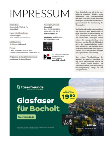 RedaktionKirsten Bu%u00df, (V. i. S. d. P.),Roland Bu%u00df, Layout & GestaltungJohanna Eggern, Alina Moncev (Auszubildende)GastautorenDr. Simone M%u00f6llenbeckFotosCover: sinneswerk, Kirsten Bu%u00df, Kunden-/ Herstellerfotos, Adobe Stock u. a.Anzeigen- & RedaktionsschlussJeweils zum 20. jeden Monats.IMPRESSUMAnzeigenvertriebKirsten Bu%u00dfTel.: 02871/242 89 20Mobil: 0171/211 60 71kirsten@mue12.deMediadaten als PDF unter: www.pan-bocholt.deDiese Zeitschrift und alle in ihr enthaltenen einzelnen Beitr%u00e4ge sowie Abbildungen sind urheberrechtlich gesch%u00fctzt. Jede Verwertung au%u00dferhalb der engen Grenzen des Urheberrechtsgesetzes bedarf der Zustimmung der Herausgeber. Der Nachdruck von Berichten und Fotos und Anzeigen, auch auszugsweise, ist ohne ausdr%u00fcckliche Genehmigung der M%u00dc12 Verlag GmbH verboten. Druckreif %u00fcbermittelte Unterlagen k%u00f6nnen seitens der Anzeigenabteilung nicht korrigiert werden. F%u00fcr die Richtigkeit, sei es in grammatikalischer, stilistischer, inhaltlicher wie grafischer Form, haftet ausschlie%u00dflich der Auftraggeber/Inserent. Durch uns gestaltete Anzeigen sind Eigentum des M%u00dc12 Verlags.Eine weitere Ver%u00f6ffentlichung der Anzeigen in anderen Magazinen ist nur nach Genehmigung durch die M%u00dc12 Verlag GmbH m%u00f6glich, die Datenbereitstellung ist kostenpflichtig. (Rechnungsstellung erfolgt an den Anzeigennehme).D+L Printpartner GmbH, Schlavenhorst 10, 46395 Bocholtwww.DUL-print.de* Der Rabatt gilt nur f%u00fcr Neukunden. Voraussetzung ist der Abschluss eines faserfreunde-Vertrags mit einer Laufzeit von zwei Jahren. %u00c4nderungen und Irrt%u00fcmer vorbehalten. Preise inkl. Mehrwertsteuer. Weitere Informationen unter www.faserfreunde.de/tarifeGlasfaser f%u00fcr Bocholtfaserfreunde.defaserfreunde %u2013 Eine Marke der BEWDie ersten 6 Monate f%u00fcr nur1990%u20ac/Monat*93