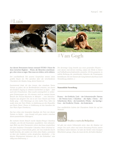 Aus diesem Bewusstsein heraus entstand STUDIO S Roots f%u00fcr diese tierischen Begleiter %u2013 Wesen, die Menschen entschleunigen, ohne etwas zu sagen. Man muss sie erleben, nicht erkl%u00e4ren. Der anschlie%u00dfende Teil unseres Gespr%u00e4ches nimmt einen gro%u00dfen Raum ein. Wir sprechen %u00fcber die verschiedenen Charaktere der Alpaka-Gang, deren Namen etc. Faszinierend finde ich den Ansatz, den einzelnen TierenNamen zu geben, die an Ber%u00fchmtheiten erinnern, um damit den Kindern Zugang zu sch%u00f6nen Geschichten zu legen %u2013 aber auch den Erwachsenen. Man taucht unweigerlich in verborgene Erinnerungen ein. Ich erinnere mich an meinen letzten Besuch des Picasso-Museums in M%u00fcnster %u2026 eine InterviewSequenz aus j%u00fcngerer Zeit, wo es um Coco Chanel und Frida Kahlo ging %u2013 Isils Hommage an eine starke Frau. Sohn Lio taufte eines der Tiere Winky, in Anlehnung an den Hauselfen aus Harry Potter. Chewy, in Anlehnung an das Aussehen der Star-Wars-Figur Chewbacca. Das hat schon eine besondere Qualit%u00e4t, die Tiere mit diesen Namen zu labeln %u2013 man bewegt sich ganz anders zwischen diesen possierlichen Felltr%u00e4gern. Bei meinem letzten Besuch wurde Alpaka-Hengst Columbus verladen, um ihn der Kastration zuzuf%u00fchren. Sein sehns%u00fcchtiger Blick aus dem Transporter schien durchaus vergleichbar mit dem Seefahrer Christopher Columbus. Beim Schicksal allerdings mag es Unterschiede geben, der eine entdeckte durch Zufall Amerika, der andere ein Leben ohne Hoden, zumindest ist %u00fcber den Seefahrer nichts dergleichen %u00fcberliefert. ;-) Vordiesem Hintergrund bekommt das %u201eEi des Kolumbus%u201c eine v%u00f6llig neue Bedeutung ;-)Die derzeitige Gang besteht aus neun grasenden Playern %u2013 zwei davon sind derzeit tr%u00e4chtig, sodass die Herde in K%u00fcrze auf Fu%u00dfballmannschaftsst%u00e4rke anw%u00e4chst. Ich bin gespannt, in welche Richtung die anstehenden Geburten die Frauenquote beeinflussen. Die vier Damen der Gang k%u00f6nnten durchaus noch Verst%u00e4rkung erfahren ;-)Namentliche Vorstellung: Picasso %u2013 der Fr%u00f6hliche | Jack %u2013 der Geheimnisvolle | Barista %u2013 der Fitness-Guru | Columbus %u2013 der Alpha | Chewy %u2013 der Sch%u00fcchterne | Betty %u2013 die Gem%u00fctliche | Winky %u2013 die Quirlige | Coco %u2013 die Friedliche | Frieda %u2013 die EntdeckerinEine ausf%u00fchrliche Galerie der Charaktere findet ihr auf der Webseite: Studio-s-roots.de/#alpakasIsil gibt mit einem Schmunzeln preis, dass die Alpakas vor einiger Zeit auch schon mal einen Recruiting-Prozess positiv beeinflusst haben k%u00f6nnten. So habe die Tochter eines heutigen Mitarbeiters gesagt: %u201ePapa, du musst da hin, die haben Alpakas.%u201c #Luis#Van GoghPortrait I 103