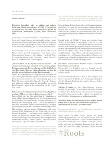 STUDIO S RootsHistorisch betrachtet w%u00e4re es richtig, mit deinem Ursprungs-/Mutterunternehmen STUDIO S Architekten zu starten. Aber an dieser Stelle bietet es sich gerade an, zun%u00e4chst das Unternehmen STUDIO S Roots zu erkl%u00e4ren, oder? Gerne. Diese Facette meines Treibens entstand nicht aus der Suche nach einem weiteren Gesch%u00e4ftsmodell heraus %u2013 sie ist die Antwort auf ein inneres Bed%u00fcrfnis. Es gilt, einen Ort zu kreieren, der R%u00fcckzug erm%u00f6glicht. Einen Platz, an dem Menschen wieder in Verbindung mit sich selbst kommen d%u00fcrfen.Heute besteht unser Ort aus einem kleinen Hof in der Natur, einem liebevoll ausgebauten Tiny House, einer Wohnung, alten B%u00e4umen %u2026 den Alpakas %u2013 und viel Weite. Ich nenne es bewusst nicht %u201eFerienhof%u201c %u2026 denn STUDIO S Roots ist kein klassisches Urlaubsangebot. %u201eMit dem Blick auf die Alpakas wach zu werden%u201c %u2026 ich erinnere mich an deinen Ausspruch bei unserem damaligen Rundgang durch die Ferienwohnung und die Einblicke in euer Tiny House. Ihr wisst schon sehr genau, wor%u00fcber ihr sprecht, welche Gef%u00fchle ihr selbst dabei empfindet %u2026Genau, das ist biografisch in uns gewachsen. Nachdem wir dieses Areal gekauft hatten, begann der Umbau des Kottens. Wir wohnten zu der Zeit in einer Mietwohnung, ganz in der N%u00e4he. Wir waren viel auf der Baustelle. Wegen des Treibens dort schien es wichtig, einen Ort zu schaffen, wo wir zur Ruhe kommen %u2013 das war die Entscheidung f%u00fcr das Projekt Tiny House. Falls sich jetzt Menschen durch das Trend-Thema Tiny House getriggert f%u00fchlen, was w%u00fcrdest du denen sagen wollen? Dass es falsch w%u00e4re, die %u00dcbersichtlichkeit der Quadratmeter eines solchen Hauses gedanklich auf den Planungsaufwand zu %u00fcbertragen. Ein solches Projekt ist mega-komplex in der Planung und Genehmigung %u2013 und %u2026 macht die Notwendigkeit einer physischen Adresse nicht entbehrlich. Deswegen war es f%u00fcr uns auch nur die naturnahe Erweiterung unserer Mietwohnung, w%u00e4hrend unserer Umbauphase. Auf etwas weniger als 20 Quadratmetern hat Deniz unserem Lio aus B%u00fcchern vorgelesen %u2026 ich konnte mich bisweilen zur%u00fcckziehen, um den Verlust meines Vaters zu verarbeiten. Nach einem Ersch%u00f6pfungs-Nickerchen durch die Sonne geweckt zu werden oder durch die Laute der Alpakas %u2013 all diese Momentehabe uns die Magie dieses Ortes sp%u00fcren lassen. Ich erfahre in diesem Zusammenhang, dass Menschen aus den unterschiedlichsten Motiven und Lebenssituationen dieses Angebot wahrnehmen, wie z. B. ein Forscher des FraunhoferInstituts aus Berlin, der konzentriert, aber naturnah arbeiten wollte %u2026 eine Psychologin, die ein Buchprojekt umsetzte %u2026 ein Paar, das sich spontan dazu entschlossen hat, den Verlust ihres %u201eSternchens%u201c (ein Kind, das w%u00e4hrend der Schwangerschaft oder kurz nach der Geburt verstorben ist) zu verarbeiten. Isil f%u00fchrt fort: Es ist ein Raum, in dem Natur, Stille und Gestaltung ineinanderflie%u00dfen. F%u00fcr kleine Retreats, achtsame Momente, kreative Impulse oder einfach nur zum Durchatmen. Ich glaube fest daran, dass wir dann am erfolgreichsten sind, wenn wir aus unserer pers%u00f6nlichen Tiefe und einer dankbaren F%u00fclle heraus arbeiten. Deshalb stelle ich STUDIO S Roots auch meinem Team STUDIO S Architekten zur Verf%u00fcgung. Es ist ein Ort, den wir gemeinsam nutzen %u2013 nicht nur f%u00fcr kreative Auszeiten, sondern auch f%u00fcr strategische Arbeit. Der n%u00e4chste Termin mit meinem engsten F%u00fchrungsteam wird bewusst nicht in unseremB%u00fcro an der Bernhard-Otte-Stra%u00dfe stattfinden, sondern hier, am Finkenbusch %u2013 in der Natur, vielleicht sogar drau%u00dfen bei den Alpakas. Dort, wo Gedanken fliegen k%u00f6nnen. Dort, wo wir losgel%u00f6st vom Alltag unsere gemeinsamen Visionen sortieren und eine kraftvolle Zukunft f%u00fcr uns gestalten. Was k%u00f6nnte sich aus diesen Wurzeln heraus %u2026 aus diesen Roots Weiteres entwickeln? Derzeit f%u00fchre ich Gespr%u00e4che mit einer Yogalehrerin, die von der Energie begeistert ist und hier gerne mit Menschen arbeiten w%u00fcrde. In absehbarer Zukunft wird es dort in dem einzigen noch nicht restaurierten Geb%u00e4ude einen Schulungsraum geben, der f%u00fcr F%u00fchrungs-Coachings und andere Business-Anl%u00e4sse buchbar sein wird. STUDIO S Roots ist kein abgeschlossenes Konzept, sondern ein lebendiger Ort. F%u00fcr uns ist das ein Pilotprojekt,wo Natur, Tiere, Kompetenzen miteinander ins Schwingen kommen. Ein Feld, das sich selbst entfaltet %u2013 mit der Zeit, mitden Menschen, die dazukommen, und mit mir selbst. Wenn sich dieser Geheimtipp so weiterentwickelt, k%u00f6nnte es sein, dass es mit der Ruhe und einem ungest%u00f6rten Sundowner mit Picasso & Co. bald vorbei ist. Das zustimmende L%u00e4cheln von Deniz l%u00e4sst ahnen, dass dieses Zukunftsbild Realit%u00e4t werden k%u00f6nnte. Wenn dieser Zeitpunkt kommt, haben wir genug Erfahrungen gesammelt, um ein solches Projekt auch an anderen Orten zu realisieren %u2026 einen skalierbaren BusinessCase daraus zu kreieren. Der Gedanke an STUDIO S Roots erf%u00fcllt mich und die bisherige Resonanz zeigt, dass wir damit den Nerv von vielen Menschen treffen k%u00f6nnten.#Roots104 I Portrait