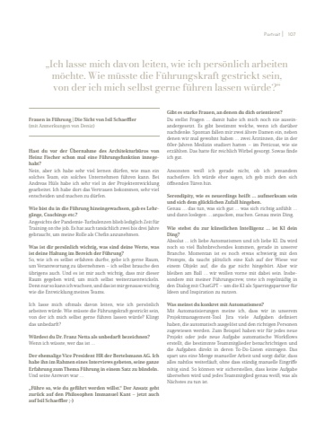%u201eIch lasse mich davon leiten, wie ich pers%u00f6nlich arbeiten m%u00f6chte. Wie m%u00fcsste die F%u00fchrungskraft gestrickt sein, von der ich mich selbst gerne f%u00fchren lassen w%u00fcrde?%u201cFrauen in F%u00fchrung | Die Sicht von Isil Schaeffler (mit Anmerkungen von Deniz)Hast du vor der %u00dcbernahme des Architekturb%u00fcros von Heinz Fischer schon mal eine F%u00fchrungsfunktion innegehabt? Nein, aber ich habe sehr viel lernen d%u00fcrfen, wie man ein solches Team, ein solches Unternehmen f%u00fchren kann. Bei Andreas H%u00fcls habe ich sehr viel in der Projektentwicklung gearbeitet. Ich habe dort das Vertrauen bekommen, sehr viel entscheiden und machen zu d%u00fcrfen.Wie bist du in die F%u00fchrung hineingewachsen, gab es Lehrg%u00e4nge, Coachings etc.?Angesichts der Pandemie-Turbulenzen blieb lediglich Zeit f%u00fcr Training on the job. Es hat auch tats%u00e4chlich zwei bis drei Jahre gebraucht, um meine Rolle als Chefin anzunehmen. Was ist dir pers%u00f6nlich wichtig, was sind deine Werte, was ist deine Haltung im Bereich der F%u00fchrung? So, wie ich es selbst erfahren durfte, gebe ich gerne Raum, um Verantwortung zu %u00fcbernehmen %u2013 ich selbst brauche den%u00fcbrigens auch. Und es ist mir auch wichtig, dass mir dieser Raum gegeben wird, um mich selbst weiterzuentwickeln. Denn nur so kann ich wachsen, und das ist mir genauso wichtigwie die Entwicklung meines Teams.Ich lasse mich oftmals davon leiten, wie ich pers%u00f6nlich arbeiten w%u00fcrde. Wie m%u00fcsste die F%u00fchrungskraft gestrickt sein, von der ich mich selbst gerne f%u00fchren lassen w%u00fcrde? Klingt das unbedarft? W%u00fcrdest du Dr. Franz Netta als unbedarft bezeichnen? Wenn ich w%u00fcsste, wer das ist %u2026 Der ehemalige Vice President HR der Bertelsmann AG. Ich habe ihn im Rahmen eines Interviews gebeten, seine ganze Erfahrung zum Thema F%u00fchrung in einem Satz zu b%u00fcndeln. Und seine Antwort war %u2026%u201eF%u00fchre so, wie du gef%u00fchrt werden willst.%u201c Der Ansatz geht zur%u00fcck auf den Philosophen Immanuel Kant %u2013 jetzt auch auf Isil Schaeffler ;-)Gibt es starke Frauen, an denen du dich orientierst? Du stellst Fragen %u2026 damit habe ich mich noch nie auseinandergesetzt. Es gibt bestimmt welche, wenn ich dar%u00fcber nachdenke. Spontan fallen mir zwei %u00e4ltere Damen ein, neben denen wir mal gewohnt haben %u2026 zwei %u00c4rztinnen, die in der 60er-Jahren Medizin studiert hatten %u2013 im Petticoat, wie sie erz%u00e4hlten. Das hatte f%u00fcr reichlich Wirbel gesorgt. Sowas finde ich gut. Ansonsten wei%u00df ich gerade nicht, ob ich jemandem nacheifere. Ich w%u00fcrde eher sagen, ich geb mich den sich %u00f6ffnenden T%u00fcren hin. Serendipity, wie es neuerdings hei%u00dft %u2026 aufmerksam sein und sich dem gl%u00fccklichen Zufall hingeben. Genau %u2026 das tun, was sich gut %u2026 was sich richtig anf%u00fchlt %u2026 und dann loslegen %u2026 anpacken, machen. Genau mein Ding.Wie stehst du zur k%u00fcnstlichen Intelligenz %u2026 ist KI dein Ding?Absolut %u2026 ich liebe Automatismen und ich liebe KI. Da wird noch so viel Bahnbrechendes kommen, gerade in unserer Branche. Momentan ist es noch etwas schwierig mit den Prompts, da taucht pl%u00f6tzlich eine Kuh auf der Wiese vor einem Objekt auf, die da gar nicht hingeh%u00f6rt. Aber wir bleiben am Ball %u2026 wir wollen vorne mit dabei sein. Insbesondere mit meiner F%u00fchrungscrew, trete ich regelm%u00e4%u00dfig in den Dialog mit ChatGPT %u2013 um die KI als Sparringspartner f%u00fcr Ideen und Inspiration zu nutzen. Was meinst du konkret mit Automatismen? Mit Automatisierungen meine ich, dass wir in unserem Projektmanagement-Tool Jira viele Aufgaben definiert haben, die automatisch ausgel%u00f6st und den richtigen Personen zugewiesen werden. Zum Beispiel haben wir f%u00fcr jedes neue Projekt oder jede neue Aufgabe automatische Workflows erstellt, die bestimmte Teammitglieder benachrichtigen und die Aufgaben direkt in deren To-Do-Listen eintragen. Das spart uns eine Menge manueller Arbeit und sorgt daf%u00fcr, dass alles nahtlos weiterl%u00e4uft, ohne dass st%u00e4ndig manuelle Eingriffe n%u00f6tig sind. So k%u00f6nnen wir sicherstellen, dass keine Aufgabe %u00fcbersehen wird und jedes Teammitglied genau wei%u00df, was als N%u00e4chstes zu tun ist.Portrait I 107