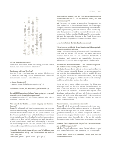 Wo bist du selbst oldschool?Nimmst du mich ernst, wenn ich dir sage, dass ich immer meinen alten Taschenrechner dabeihabe? Du nimmst mich auf den Arm? Nein, im Ernst %u2026 und zwar den aus meiner Schulzeit, mit so einem Yin-und-Yang-Zeichen und noch einer Formel aus meiner letzten Klausur %u2026 auf der R%u00fcckseite. %u2026 einem Spickzettel? %u2026 nennen wir es %u201eGed%u00e4chtnisunterst%u00fctzung%u201c ;-)So viel zum Thema %u201eIch war immer gut in Mathe%u201c ;-) Ihr seid 2020 mit einem Zehner-Team gestartet %u2013 wie gro%u00df ist mittlerweile deine F%u00fchrungsspanne? Mittlerweile sind wir 25 Individuen, inklusive aller Werksstudenten, Deniz und mir. Wie h%u00e4ndelt ihr beiden %u2026 euren Umgang im BusinessKontext? Deniz: Als Isil damals mit Lio schwanger wurde, war es meine bewusste Entscheidung, mein Bionik-Studium abzubrechen und den Part zu %u00fcbernehmen, der mit %u201ealtem Denken%u201c eher den Frauen zugedacht wurde. Ich habe Isil dabei unterst%u00fctzt, sich bestm%u00f6glich auf ihren Beruf als Architektin konzentrieren zu k%u00f6nnen, in dem Job Fu%u00df zu fassen und auch das n%u00e4chste Level zu realisieren, sprich, sich selbstst%u00e4ndig zu machen.Vor dem Hintergrund der Herkunft unserer Eltern sicherlich ein besonders ungew%u00f6hnlich anmutender Schritt.War es f%u00fcr dich schwierig zur%u00fcckzutreten? Wie klappt euer Zusammenspiel im Alltag %u2026 im Unternehmen, wo auch du, Deniz, t%u00e4tig bist? Deniz: Jetzt gerade %u2026 sprich heute %u2026 ganz gut ;-) Was sind die Themen, um die sich Deniz verantwortlich k%u00fcmmert bei STUDIO S? Auf der Webseite steht %u201eEDV- und Finanzmanager%u201c?Isil: Das entspricht unserer Arbeitsrealit%u00e4t. Dazu geh%u00f6ren vor allen Recherchen zu Steuerberater-Themen, Versicherungen, Fuhrpark, aber auch unserer Arbeitsvertr%u00e4ge. Die fortschreitende Digitalisierung unserer Prozesse sowie unsere digitalen Komponenten erfordern ebenfalls Deniz mit seinem technischen Sachverstand im Hinblick auf Serverkompatibilit%u00e4t und den nahenden Umstieg in die Cloud, den wir mit den genannten Programmen bereits vorbereitet haben.%u2026%u2026 und sein Talent, die Kabel zu kaschieren ;-)Wie schaut es, gef%u00e4llt dir deine Frau in der F%u00fchrungsfunktion in ihrem Unternehmen? Deniz: Ein klares Ja! Ich mag Isil als smart-taffe Unternehmerin,aber auch die weiche Seite an ihr %u2013 ich finde jede dieserFacetten meiner Frau toll. Als Mitarbeiter der STUDIO S Architekten und nat%u00fcrlich als pers%u00f6nlicher Vertrauter, bekomme ich pers%u00f6nlich mit, wie gut sie ihre Sache macht. Wie kommst du Isil damit klar %u2026 mit Eurem divergierenden Rollenverst%u00e4ndnis im Job und Privat? Isil: Dadurch, dass Deniz mich ja so kennengelernt hat, wir ein Paar wurden, ist das f%u00fcr keinen von uns so ungewohnt, wie sich das f%u00fcr Au%u00dfenstehende vielleicht anf%u00fchlt. Ich war von Tag eins an immer die strebsame Person, die st%u00e4ndig gedanklich in Bewegung war. W%u00e4hrend andere sich auf Partys auslebten, sa%u00df ich %u00fcber meinen Entw%u00fcrfen. Deniz hat mich immer dabei unterst%u00fctzt. Die Phase der Schwangerschaft mit Liv war extrem herausfordernd f%u00fcr mich %u2013 mit dem, was alles um uns herum passierte. Es gab Tage, da habe ich Deniz und Lio zwei bis drei Tage am St%u00fcck %u00fcberhaupt nicht gesehen. Ich hatte alle Freiheiten, mich auf meinen Job und meine Schwangerschaft zu konzentrieren. Wenn Deniz Unterst%u00fctzung brauchte, durften wir uns auf meine Mutter verlassen. Was verbindet %u2026 was unterscheidet euch? Deniz: Ich w%u00fcrde uns beide als chancenorientiert und unerm%u00fcdlich bezeichnen. Wir erg%u00e4nzen uns sehr gut, denn w%u00e4hrend ich in der Regel noch im %u201eWenn und aber%u201c der Details gedanklich verweile, ist Isil oftmals energetisch und strukturiert bereits ein paar Schritte weiter %u2013 hin zu potenziellen L%u00f6sungen und Ideen. Von daher ist es f%u00fcr uns die logische Konsequenz, dass sie die Unternehmerin verk%u00f6rpert und lebt.Was sind f%u00fcr dich pers%u00f6nlich die gr%u00f6%u00dften Herausforderungen im F%u00fchrungsgesch%u00e4ft? Isil: Der Versuch, alles unter einen Hut zu bringen %u2026 was nicht immer funktioniert und wo es sehr viel zu lernen gilt. Worauf muss man sich einstellen, wenn man mit dir zusammenarbeitet?%u201eIch mag es, wenn wir Entscheidungen im Team treffen %u2013 bei denen sich jeder abgeholt und mitge-nommen f%u00fchlt.%u201cPortrait I 109