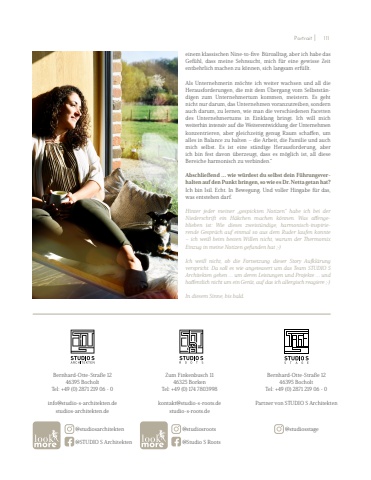 Bernhard-Otte-Stra%u00dfe 1246395 BocholtTel: +49 (0) 2871 219 06 - 0info@studio-s-architekten.destudios-architekten.deZum Finkenbusch 1146325 BorkenTel: +49 (0) 174 7803998kontakt@studio-s-roots.destudio-s-roots.deBernhard-Otte-Stra%u00dfe 1246395 BocholtTel: +49 (0) 2871 219 06 - 0Partner von STUDIO S Architekten @studiosarchitekten @STUDIO S Architekten @studiosroots @Studio S Roots @studiosstageeinem klassischen Nine-to-five B%u00fcroalltag, aber ich habe das Gef%u00fchl, dass meine Sehnsucht, mich f%u00fcr eine gewisse Zeit entbehrlich machen zu k%u00f6nnen, sich langsam erf%u00fcllt. Als Unternehmerin m%u00f6chte ich weiter wachsen und all die Herausforderungen, die mit dem %u00dcbergang vom Selbstst%u00e4ndigen zum Unternehmertum kommen, meistern. Es geht nicht nur darum, das Unternehmen voranzutreiben, sondern auch darum, zu lernen, wie man die verschiedenen Facettendes Unternehmertums in Einklang bringt. Ich will mich weiterhin intensiv auf die Weiterentwicklung der Unternehmenkonzentrieren, aber gleichzeitig genug Raum schaffen, um alles in Balance zu halten %u2013 die Arbeit, die Familie und auch mich selbst. Es ist eine st%u00e4ndige Herausforderung, aber ich bin fest davon %u00fcberzeugt, dass es m%u00f6glich ist, all diese Bereiche harmonisch zu verbinden.%u201cAbschlie%u00dfend %u2026 wie w%u00fcrdest du selbst dein F%u00fchrungsverhalten auf den Punkt bringen, so wie es Dr. Netta getan hat? Ich bin Isil. Echt. In Bewegung. Und voller Hingabe f%u00fcr das, was entstehen darf. Hinter jeder meiner %u201egespickten Notizen%u201c habe ich bei der Niederschrift ein H%u00e4kchen machen k%u00f6nnen. Was offengeblieben ist: Wie dieses zweist%u00fcndige, harmonisch-inspirierende Gespr%u00e4ch auf einmal so aus dem Ruder laufen konnte %u2013 ich wei%u00df beim besten Willen nicht, warum der Thermomix Einzug in meine Notizen gefunden hat ;-) Ich wei%u00df nicht, ob die Fortsetzung dieser Story Aufkl%u00e4rung verspricht. Da soll es wie angeteasert um das Team STUDIO S Architekten gehen %u2026 um deren Leistungen und Projekte %u2026 und hoffentlich nicht um ein Ger%u00e4t, auf das ich allergisch reagiere ;-) In diesem Sinne, bis bald.Portrait 111 I
