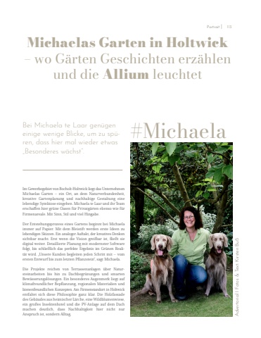 Michaelas Garten in Holtwick %u2013 wo G%u00e4rten Geschichten erz%u00e4hlen und die Allium leuchtetBei Michaela te Laar gen%u00fcgen einige wenige Blicke, um zu sp%u00fcren, dass hier mal wieder etwas %u201eBesonderes w%u00e4chst%u201c. Im Gewerbegebiet von Bocholt-Holtwick liegt das Unternehmen Michaelas Garten %u2013 ein Ort, an dem Naturverbundenheit, kreative Gartenplanung und nachhaltige Gestaltung eine lebendige Symbiose eingehen. Michaela te Laar und ihr Team erschaffen hier gr%u00fcne Oasen f%u00fcr Privatg%u00e4rten ebenso wie f%u00fcr Firmenareale. Mit Sinn, Stil und viel Hingabe.Der Entstehungsprozess eines Gartens beginnt bei Michaela immer auf Papier. Mit dem Bleistift werden erste Ideen zu lebendigen Skizzen. Ein analoger Auftakt, der kreatives Denken sichtbar macht. Erst wenn die Vision greifbar ist, flie%u00dft sie digital weiter. Detaillierte Planung mit modernster Software folgt, bis schlie%u00dflich das perfekte Ergebnis im Gr%u00fcnen Realit%u00e4t wird. %u201eUnsere Kunden begleiten jeden Schritt mit %u2013 vom ersten Entwurf bis zum letzten Pflanzstein%u201c, sagt Michaela.Die Projekte reichen von Terrassenanlagen %u00fcber Natursteinarbeiten bis hin zu Dachbegr%u00fcnungen und smarten Bew%u00e4sserungsl%u00f6sungen. Ein besonderes Augenmerk liegt auf klimafreundlicher Bepflanzung, regionalen Materialien und bienenfreundlichen Konzepten. Am Firmenstandort in Holtwick entfaltet sich diese Philosophie ganz klar. Die Holzfassade des Geb%u00e4udes aus heimischer L%u00e4rche, eine Wildblumenwiese, ein gro%u00dfes Insektenhotel und die PV-Anlage auf dem Dach machen deutlich, dass Nachhaltigkeit hier nicht nur Anspruch ist, sondern Alltag.#MichaelaAdvertorial I Fotos & Text: Kirsten Bu%u00dfPortrait I 113