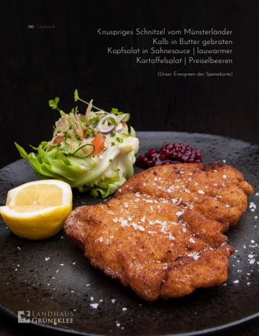 Knuspriges Schnitzel vom M%u00fcnsterl%u00e4nder Kalb in Butter gebratenKopfsalat in Sahnesauce | lauwarmer Kartoffelsalat | Preiselbeeren(Unser Evergreen der Speisekarte)120 I Kulinarik