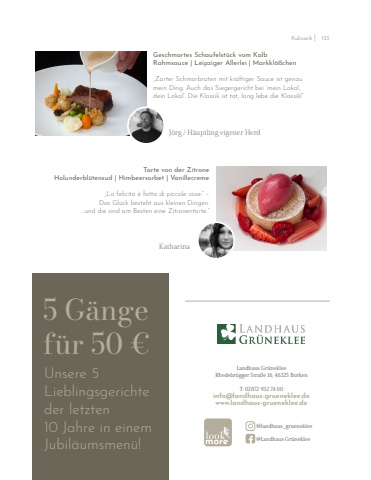 Geschmortes Schaufelst%u00fcck vom KalbRahmsauce | Leipziger Allerlei | Markkl%u00f6%u00dfchen%u201eZarter Schmorbraten mit kr%u00e4ftiger Sauce ist genaumein Ding. Auch das Siegergericht bei %u2018mein Lokal,dein Lokal%u2018. Die Klassik ist tot, lang lebe die Klassik!%u201cJ%u00f6rg / H%u00e4uptling eigener HerdTarte von der ZitroneHolunderbl%u00fctensud | Himbeersorbet | Vanillecreme%u201eLa felicit%u00e0 %u00e8 fatta di piccole cose.%u201c %u2013 Das Gl%u00fcck besteht aus kleinen Dingen. ...und die sind am Besten eine Zitronentarte.%u201cKatharina Landhaus Gr%u00fcnekleeRhedebr%u00fcgger Stra%u00dfe 16, 46325 BorkenT: 02872 932 74 00info@landhaus-grueneklee.dewww.landhaus-grueneklee.de @landhaus_grueneklee @Landhaus Gr%u00fcneklee Unsere 5 Lieblingsgerichte der letzten 10 Jahre in einemJubil%u00e4umsmen%u00fc!5 G%u00e4nge f%u00fcr 50 %u20acKulinarik I 123
