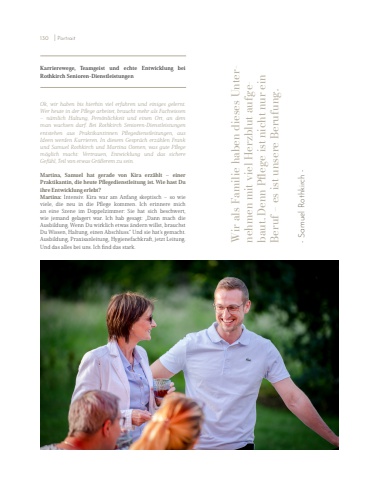 Karrierewege, Teamgeist und echte Entwicklung bei Rothkirch Senioren-DienstleistungenOk, wir haben bis hierhin viel erfahren und einiges gelernt. Wer heute in der Pflege arbeitet, braucht mehr als Fachwissen %u2013 n%u00e4mlich Haltung, Pers%u00f6nlichkeit und einen Ort, an dem man wachsen darf. Bei Rothkirch Senioren-Dienstleistungen entstehen aus Praktikantinnen Pflegedienstleitungen, aus Ideen werden Karrieren. In diesem Gespr%u00e4ch erz%u00e4hlen Frank und Samuel Rothkirch und Martina Oomen, was gute Pflege m%u00f6glich macht: Vertrauen, Entwicklung und das sichere Gef%u00fchl, Teil von etwas Gr%u00f6%u00dferem zu sein.Martina, Samuel hat gerade von Kira erz%u00e4hlt %u2013 einer Praktikantin, die heute Pflegedienstleitung ist. Wie hast Du ihre Entwicklung erlebt?Martina: Intensiv. Kira war am Anfang skeptisch %u2013 so wie viele, die neu in die Pflege kommen. Ich erinnere mich an eine Szene im Doppelzimmer: Sie hat sich beschwert, wie jemand gelagert war. Ich hab gesagt: %u201eDann mach die Ausbildung. Wenn Du wirklich etwas %u00e4ndern willst, brauchst Du Wissen, Haltung, einen Abschluss.%u201c Und sie hat%u2019s gemacht. Ausbildung, Praxisanleitung, Hygienefachkraft, jetzt Leitung. Und das alles bei uns. Ich find das stark.Wir als Familie haben dieses Unternehmen mit viel Herzblut aufge- baut. Denn Pflege ist nicht nur ein Beruf %u2013 es ist unsere Berufung. - Samuel Rothkirch -130 I Portrait
