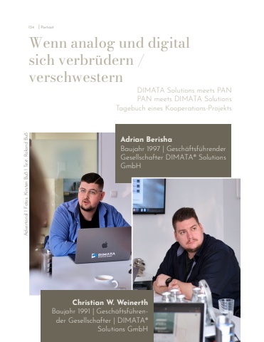 Wenn analog und digital sich verbr%u00fcdern / verschwesternDIMATA Solutions meets PAN PAN meets DIMATA SolutionsTagebuch eines Kooperations-ProjektsAdrian BerishaBaujahr 1997 | Gesch%u00e4ftsf%u00fchrender Gesellschafter DIMATA%u00ae Solutions GmbHChristian W. WeinerthBaujahr 1991 | Gesch%u00e4ftsf%u00fchrender Gesellschafter | DIMATA%u00ae Solutions GmbHAdvertorial I Fotos: Kirsten Bu%u00df I Text: Roland Bu%u00df 134 I Portrait