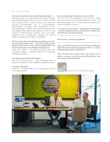 Die werden sicherlich nichts mit Fu%u00dfball gemein haben %u2026 ;-)Richtig. Ich habe vor einigen Jahren das Thema Entwicklung und lebenslanges Lernen f%u00fcr mich entdeckt. Seit 2021 bin ich IHK-zertifizierter Train-the-Trainer und seitdem auf diversen Veranstaltungen und in unterschiedlichen Themenfeldern unterwegs. Nach verschiedenen Zertifikats-Ausbildungen, zun%u00e4chst zum Business-Moderator und anschlie%u00dfend zum Kommunikationstrainer, habe ich mich k%u00fcrzlich als Online-Trainer ausbilden lassen und durfte zeitgleich einen mehrj%u00e4hrigen Lehrgang im Bereich Business-Management erfolgreich abschlie%u00dfen.Die Faszination f%u00fcr Pers%u00f6nlichkeitsentwicklung und Lifelong Learning verbindet uns %u2026 auch der Einstieg mit dem Baujahr. Meine Worte waren: Ich bin Baujahr 1963 und Vater von drei sehr unterschiedlichen Charakteren. Auch nicht schlecht %u2026 ich d%u00fcrfte momentan noch zwei Charaktere anf%u00fchren %u2013 demn%u00e4chst sind es vier %u2013 bei uns sind Zwillinge im Anflug ;-) Was sollte man noch %u00fcber dich wissen? Dass ich Ur-Bocholter bin %u2013 mein Elternhaus steht in Holtwick. Und dass ich leidenschaftlicher Fr%u00fchaufsteher bin. Was ist f%u00fcr dich fr%u00fch?03.30 Uhr %u2013 seit Jahren liebe ich es, zu dieser fr%u00fchen Stunde in den Tag zu starten. Bist du wahnsinnig? Wann gehst du denn zu Bett? Um 21.30 Uhr. Netzwerkabende, von denen du vorhin sprachst, sind eine echte Herausforderung f%u00fcr mich %u2026 die Wahrscheinlichkeit, dass ich beim Business-Small-Talk am Stehtisch einschlafe, ist gro%u00df ;-)Du verpasst was vom Leben %u2026 zumindest vom Nachtleben %u2013 aber die Zwillinge werden es schon richten ;-) Blicken wir in die Historie von Fliesen H%u00fcning. Die Wurzeln %u2026 des leisen Big PlayersAuf eurer Webseite steht zu lesen, dass Fliesen H%u00fcning im Jahre 1964 vom Senior Heinz gegr%u00fcndet wurde %u2013 in einem 36 Quadratmeter gro%u00dfen Nebenraum.Wenn wir auf euren jetzigen Status quo schauen, ist es schwer zu fassen, wie ihr euch innerhalb dieser zwei Generationen entwickelt habt. Historie von Fliesen H%u00fcning146 I Living & Lifestyle