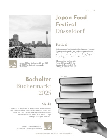 Foto: Roger SteinFoto: FreepikFreitag, 20. Juni bis Sonntag, 22. Juni 2025, ab 12.00 Uhr, Rheinuferpromenade, D%u00fcsseldorfJapan FoodFestivalD%u00fcsseldorfFestivalErlebe das Japan Food Festival 2025 in D%u00fcsseldorf mit einer Vielzahl an traditionellen und modernen japanischen Gerichten. Neben kulinarischen Gen%u00fcssen gibt es spannende Workshops und Live-Demonstrationen. Ein Highlight f%u00fcr alle, die die japanische Kultur und K%u00fcche lieben!%u00d6ffnungszeiten des Festivals:Freitag, 20. Juni: ab 17.00 UhrSamstag, 21. Juni: ab 12.00 UhrSonntag, 27. Juni: ab 12.00 UhrMarktOpen air locken zahlreiche Antiquare aus Deutschland und den Niederlanden mit ihren B%u00fcchern, Grafiken, Noten, Postkarten und Vinyl. Ein Treffpunkt f%u00fcr B%u00fcchersammler und B%u00fccherfreunde. Hier finden Sie sicher auch Dinge, die sie gar nicht gesucht haben %u2026Sonntag, 07. September 2025, ab 11.00 Uhr, Gasthausplatz, BocholtBocholter B%u00fcchermarkt 2025Kulturseitensponsoring durch D+L Printpartner GmbHKultur I 13