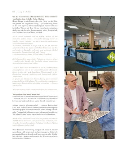 Um das zu verstehen, schildere bitte mal deine Eindr%u00fccke vom Senior, dem Gr%u00fcnder Heinz H%u00fcning.Heinz H%u00fcning ist ein Handwerker, der Fliese von der Pike auf gelernt hat. Ungemein flei%u00dfig %u2026 jahrzehntelang selbst an der Kelle agierend. Die Ausbildung zum Meister und sein fachliches Wissen auf dem Niveau eines Sachverst%u00e4ndigen sind quasi die logische Konsequenzen seiner Leidenschaft f%u00fcrs Handwerk und das Thema Keramik. Bis zu diesem Interview war der Begriff Keramik bei mir irgendwie anders belegt %u2026 ich dachte bislang immer an Essteller, Platten, Sch%u00fcsseln %u2026 wie wir sie gerne aus mediterranen Urlaubsl%u00e4ndern mitbringen. Im Grunde genommen ist es ja auch so, wie ich nachlese: Keramik wird als die Kunst und Technik bezeichnet, aus Ton und anderen Rohstoffen geformte und gebrannte Artikel herzustellen. Dazu geh%u00f6ren halt auch Fliesen. Ich er%u00f6rtere mein veraltetes Bild von diesen Produkten. F%u00fcr Sebastian kein ungewohntes Ph%u00e4nomen, wie er versichert %u2013 zugleich der Antrieb, die Geschichte dieses historischen Baustoffes neu/anders zu erz%u00e4hlen. Keramik finde man mittlerweile in vielen, hochmodernen Einsatzgebieten, wie in der Automobilindustrie (Bremsscheiben), in der Luft- und Raumfahrt (W%u00e4rmeschutz), in der chemischen Industrie, Medizintechnik, Solartechnik, Mikroelektronik etc. Es geh%u00f6re zur Mission von Fliesen H%u00fcning, dieses veraltete Image des Keramik-Produktes Fliese aufzupolieren und deren superbreites Einsatzgebiet salonf%u00e4hig zu machen %u2013 drinnen wie drau%u00dfen. Wir widmen uns zun%u00e4chst weiter den Wurzeln des Unternehmens. Was zeichnet den Senior weiter aus?Ich w%u00fcrde ihn als Netzwerker der ersten Stunde bezeichnen %u2013 der sich der N%u00e4he zu unseren niederl%u00e4ndischen Nachbarn bewusst war und auch diesen Markt f%u00fcr sich entdeckt hat. Anhand unserer Warenwirtschaft %u2026 unserer Kundendatei kann man nachvollziehen, dass es jenseits der Grenze ganze Stra%u00dfenz%u00fcge gibt, wo wir aktiv waren. Heinz H%u00fcning hat dort echte Pionierarbeit geleistet, wovon wir heute noch profitieren. Wir haben Kunden bis zur niederl%u00e4ndischen Nordseek%u00fcste. Dieser Passus erinnert mich an die Aussage eines Freundes im Vorfeld dieses Interviews, der anerkennend hervorhob, wieviel gelbe Kennzeichen auf dem Parkplatz von Fliesen H%u00fcning regelm%u00e4%u00dfig zu ersp%u00e4hen sind. Diese bilaterale Ausrichtung spiegelt sich auch in unserer Ausstellung %u2026ich zeige euch im Anschluss gerne historisch anmutende Fliesen, die sich auch heute noch gro%u00dfer Beliebtheit erfreuen %u2013 jenseits und diesseits der Grenzen zu unseren holl%u00e4ndischen Nachbarn.148 I Living & Lifestyle