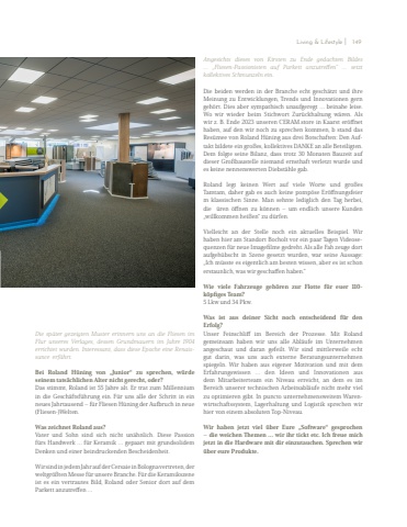 Die sp%u00e4ter gezeigten Muster erinnern uns an die Fliesen im Flur unseres Verlages, dessen Grundmauern im Jahre 1904 errichtet wurden. Interessant, dass diese Epoche eine Renaissance erf%u00e4hrt. Bei Roland H%u00fcning von %u201eJunior%u201c zu sprechen, w%u00fcrde seinem tats%u00e4chlichen Alter nicht gerecht, oder? Das stimmt, Roland ist 55 Jahre alt. Er trat zum Millennium in die Gesch%u00e4ftsf%u00fchrung ein. F%u00fcr uns alle der Schritt in ein neues Jahrtausend %u2013 f%u00fcr Fliesen H%u00fcning der Aufbruch in neue (Fliesen-)Welten. Was zeichnet Roland aus? Vater und Sohn sind sich nicht un%u00e4hnlich. Diese Passion f%u00fcrs Handwerk %u2026 f%u00fcr Keramik %u2026 gepaart mit grundsolidem Denken und einer beindruckenden Bescheidenheit. Wir sind in jedem Jahr auf der Cersaie in Bologna vertreten, der weltgr%u00f6%u00dften Messe f%u00fcr unsere Branche. F%u00fcr die Keramikszene ist es ein vertrautes Bild, Roland oder Senior dort auf dem Parkett anzutreffen %u2026 Angesichts dieses von Kirsten zu Ende gedachten Bildes %u2026 %u201eFliesen-Passionisten auf Parkett anzutreffen%u201c %u2026 setzt kollektives Schmunzeln ein. Die beiden werden in der Branche echt gesch%u00e4tzt und ihre Meinung zu Entwicklungen, Trends und Innovationen gern geh%u00f6rt. Dies aber sympathisch unaufgeregt %u2026 beinahe leise. Wo wir wieder beim Stichwort Zur%u00fcckhaltung w%u00e4ren. Als wir z. B. Ende 2023 unseren CERAM.store in Kaarst er%u00f6ffnet haben, auf den wir noch zu sprechen kommen, b stand das Res%u00fcmee von Roland H%u00fcning aus drei Botschaften: Den Auftakt bildete ein gro%u00dfes, kollektives DANKE an alle Beteiligten. Dem folgte seine Bilanz, dass trotz 30 Monaten Bauzeit auf dieser Gro%u00dfbaustelle niemand ernsthaft verletzt wurde und es keine nennenswerten Diebst%u00e4hle gab. Roland legt keinen Wert auf viele Worte und gro%u00dfes Tamtam, daher gab es auch keine pomp%u00f6se Er%u00f6ffnungsfeier m klassischen Sinne. Man sehnte lediglich den Tag herbei, die %u00fcren %u00f6ffnen zu k%u00f6nnen %u2013 um endlich unsere Kunden %u201ewillkommen hei%u00dfen%u201c zu d%u00fcrfen. Vielleicht an der Stelle noch ein aktuelles Beispiel. Wirhaben hier am Standort Bocholt vor ein paar Tagen Videosequenzen f%u00fcr neue Imagefilme gedreht. Als alle Fah zeuge dort aufgeh%u00fcbscht in Szene gesetzt wurden, war seine Aussage: %u201eIch m%u00fcsste es eigentlich am besten wissen, aber es ist schon erstaunlich, was wir geschaffen haben.%u201c Wie viele Fahrzeuge geh%u00f6ren zur Flotte f%u00fcr euer 110-k%u00f6pfiges Team? 5 Lkw und 34 Pkw.Was ist aus deiner Sicht noch entscheidend f%u00fcr den Erfolg? Unser Feinschliff im Bereich der Prozesse. Mit Roland gemeinsam haben wir uns alle Abl%u00e4ufe im Unternehmen angeschaut und daran gefeilt. Wir sind mittlerweile echt gut darin, was uns auch externe Beratungsunternehmen spiegeln. Wir haben aus eigener Motivation und mit dem Erfahrungswissen %u2026 den Ideen und Innovationen aus dem Mitarbeiterteam ein Niveau erreicht, an dem es im Bereich unserer technischen Arbeitsabl%u00e4ufe nicht mehr viel zu optimieren gibt. In puncto unternehmensweitem Warenwirtschaftssystem, Lagerhaltung und Logistik sprechen wir hier von einem absoluten Top-Niveau.Wir haben jetzt viel %u00fcber Eure %u201eSoftware%u201c gesprochen %u2013 die weichen Themen %u2026 wir ihr tickt etc. Ich freue mich jetzt in die Hardware mit dir einzutauchen. Sprechen wir %u00fcber eure Produkte.Living & Lifestyle I 149