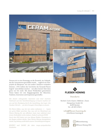 StandorteBocholt | Goch | Kaarst | M%u00fclheim | EssenDinxperloer Stra%u00dfe 33146399 BocholtTel: +49 2871 2782 0info@fliesen-huening.dewww.fliesen-huening.de @fliesenhuening @Fliesen H%u00fcning OHG Nennen wir es eine Hommage an die Keramik, ein Geb%u00e4ude, das f%u00fcr Generationen geschaffen wurde %u2026 zugleich ein Pilotprojekt als Blaupause, wie sich andere Standorte ver%u00e4ndern k%u00f6nnten ;-) Wir wollten die Geschichte der Keramik-Fliesen begreif- und erlebbar machen %u2013 mit allen Sinnen! Aber dazu gerne vor Ort mehr. Mit dieser Wirklichkeit gewordenen Vision haben wir eine Begegnungsst%u00e4tte f%u00fcr Menschen, Tradition, Innovation und Inspiration geschaffen.Mit diesem vielsagenden Statement und einer enormen Vorfreude auf eine Tatortbesichtigung in Kaarst machen wir uns auf den Rundgang durch die Ausstellung, das Lager, den Outdoor-Bereich %u2026 um dem Gesagten Fotos folgen zu lassen.Wo Worte fehlen, was bei mir selten vorkommt ;-) %u2026 lassen wir gerne Bilder sprechen. Das, was sich im Hinterland von Fliesen H%u00fcning f%u00fcr uns offenbart, kann man w%u00e4hrend einer tristen Vorbeifahrt nicht erahnen. Einfach nochmals WOW. Durch den PAN haben wir eine Menge Hidden Champions in der Region erleben d%u00fcrfen. Dass Fliesen H%u00fcning dazugeh%u00f6ren w%u00fcrde, lag bislang au%u00dferhalb unseres Vorstellungsverm%u00f6gens. RESPEKT und DANKE f%u00fcr diese mega-sympathischen Eindr%u00fccke.Living & Lifestyle I 153