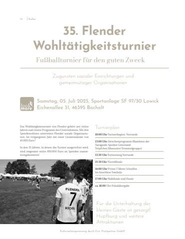 Kulturseitensponsoring durch D+L Printpartner GmbHTurnierplan10:00 Uhr Turnierbeginn: Vorrunde13:00 Uhr Zwischenprogramm (Bambinis derTanzgarde Sporker GrenzlandTr%u00f6pfchen/Mussumer Trommelgruppe)13:30 Uhr Fortsetzung Vorrunde15:30 Uhr Viertelfinale16:00 Uhr Promi-7-Meter Schie%u00dfenIm Anschluss Tombola17:00 Uhr Halbfinale und Finaleca. 18:00 Uhr Pokal%u00fcbergabe35. Flender Wohlt%u00e4tigkeitsturnierFu%u00dfballturnier f%u00fcr den guten ZweckDas Wohlt%u00e4tigkeitsturnier von Flender geh%u00f6rt seit vielen Jahren zum festen Programm des Unternehmens. Mit den Spendenerl%u00f6sen unterst%u00fctzt Flender soziale Organisationen. Im vergangenen Jahr mit einer Gesamtsumme von 45.000 Euro !In den 35 Jahren, in denen das Turnier ausgerichtet wird, sind insgesamt stolze 850.000 Euro an Spenden zusammengekommen!Zugunsten sozialer Einrichtungen und gemeinn%u00fctziger OrganisationenF%u00fcr die Unterhaltung der kleinen G%u00e4ste ist gesorgt!H%u00fcpfburg und weitere AttraktionenSamstag, 05. Juli 2025, Sportanlage SF 97/30 LowickEichenallee 31, 46395 Bocholt14 I Kultur