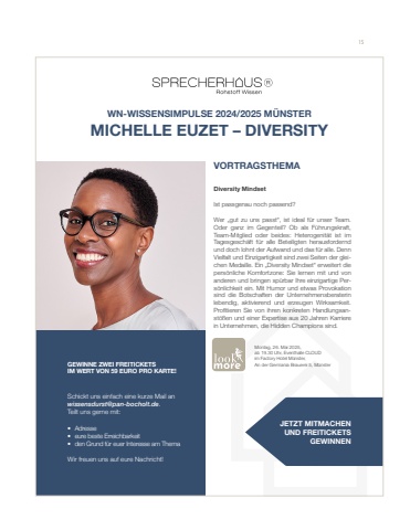 Montag, 26. Mai 2025,ab 19.30 Uhr, Eventhalle CLOUD im Factory Hotel M%u00fcnster,GEWINNE ZWEI FREITICKETS An der Germania Brauerei 5, M%u00fcnsterIM WERT VON 59 EURO PRO KARTE!Schickt uns einfach eine kurze Mail an wissensdurst@pan-bocholt.de. Teilt uns gerne mit:%u2022 Adresse%u2022 eure beste Erreichbarkeit%u2022 den Grund f%u00fcr euer Interesse am ThemaWir freuen uns auf eure Nachricht!WN-WISSENSIMPULSE 2024/2025 M%u00dcNSTERMICHELLE EUZET %u2013 DIVERSITYJETZT MITMACHEN UND FREITICKETS GEWINNENVORTRAGSTHEMADiversity MindsetIst passgenau noch passend?Wer %u201egut zu uns passt%u201c, ist ideal f%u00fcr unser Team. Oder ganz im Gegenteil? Ob als F%u00fchrungskraft, Team-Mitglied oder beides: Heterogenit%u00e4t ist im Tagesgesch%u00e4ft f%u00fcr alle Beteiligten herausfordernd und doch lohnt der Aufwand und das f%u00fcr alle. Denn Vielfalt und Einzigartigkeit sind zwei Seiten der gleichen Medaille. Ein %u201eDiversity Mindset%u201c erweitert die pers%u00f6nliche Komfortzone: Sie lernen mit und von anderen und bringen sp%u00fcrbar Ihre einzigartige Pers%u00f6nlichkeit ein. Mit Humor und etwas Provokation sind die Botschaften der Unternehmensberaterin lebendig, aktivierend und erzeugen Wirksamkeit. Profi tieren Sie von ihren konkreten Handlungsanst%u00f6%u00dfen und einer Expertise aus 20 Jahren Karriere in Unternehmen, die Hidden Champions sind.15