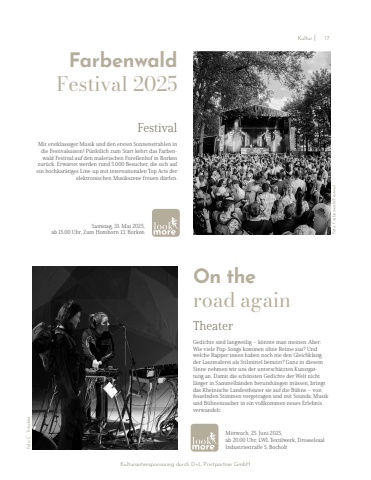 Farbenwald Festival 2025FestivalMit erstklassiger Musik und den ersten Sonnenstrahlen in die Festivalsaison! P%u00fcnktlich zum Start kehrt das Farbenwald Festival auf den malerischen Forellenhof in Borken zur%u00fcck. Erwartet werden rund 5.000 Besucher, die sich auf ein hochkar%u00e4tiges Line-up mit internationalen Top Acts der elektronischen Musikszene freuen d%u00fcrfen.Samstag, 31. Mai 2025,ab 15.00 Uhr, Zum Homborn 13, BorkenTheaterGedichte sind langweilig %u2013 k%u00f6nnte man meinen. Aber: Wie viele Pop-Songs kommen ohne Reime aus? Und welche Rapper:innen haben noch nie den Gleichklang der Lautmalerei als Stilmittel benutzt? Ganz in diesem Sinne nehmen wir uns der untersch%u00e4tzten Kunstgattung an. Damit die sch%u00f6nsten Gedichte der Welt nicht l%u00e4nger in Sammelb%u00e4nden herumh%u00e4ngen m%u00fcssen, bringt das Rheinische Landestheater sie auf die B%u00fchne %u2013 von fesselnden Stimmen vorgetragen und mit Sounds, Musik und B%u00fchnenzauber in ein vollkommen neues Erlebnis verwandelt.Mittwoch, 25. Juni 2025,ab 20.00 Uhr, LWL Textilwerk, Drosselsaal Foto: C. TritschlerIndustriestra%u00dfe 5, BocholtOn the road againFoto: Farbenwald FestivalKulturseitensponsoring durch D+L Printpartner GmbHKultur I 17