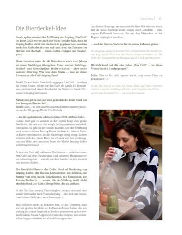 Die Bierdeckel-Idee Sarah, sp%u00e4testens mit der Er%u00f6ffnung von Imping %u201eDas Caf%u00e9%u201c im Jahre 2021 wurde auch f%u00fcr Nicht-Insider klar, dass du Imping Kaffee nicht nur ein Gesicht gegeben hast, sondern auch den Kaffeefreaks von nah und fern ein Zuhause im Herzen von Bocholt %u2013 einen Coffee-Hotspot am Neutorplatz. Diese Location wirst du als Betreiberin nach vier Jahren an einen Nachfolger %u00fcbergeben. Einer meiner LieblingsSchl%u00fcrf- und Schreibpl%u00e4tze bleibt erhalten %u2013 aber unter anderer F%u00fchrung. Was war dein Motiv %u2026 was ist deine Antwort an alle Caf%u00e9-Imping-Fans? Sarah: Es war keine Entscheidung gegen das Caf%u00e9 %u2026 sondern f%u00fcr etwas Neues. Wenn wir das Caf%u00e9 als Sarah 1.0 bezeichnen, entstand auf einem Bierdeckel die Skizze zu Sarah 2.0 %u2013 unserer Imping Kaffeewelt. Nimm uns gerne mit auf eine gedankliche Reise rund um den besagten Bierdeckel %u2026 Sarah: Also %u2026 in den oberen R%u00e4umlichkeiten unserer R%u00f6sterei an der W%u00fcppings Weide 2 in Bocholt %u2026 %u2026 die ihr spektakul%u00e4r sch%u00f6n im Jahre 2018 er%u00f6ffnet habt %u2026 Genau. Dort gab es seitdem in der ersten Etage eine gro%u00dfe Freifl%u00e4che, die wir uns f%u00fcr m%u00f6gliche Expansionen vorbehalten hatten. Es gibt in der neuen R%u00f6sterei seit der Er%u00f6ffnung auch einen sch%u00f6nen Tasting-Room, in dem wir unsere Barista-Kurse veranstalten, da die Nachfrage stetig steigt. Zudem befindet sich dort mein B%u00fcro, wo ich sehr viel Zeit verbringe, um mit Mike und unserem Team die Marke Imping Kaffee weiterzuentwickeln. Es war ein Tanz auf mehreren Hochzeiten %u2013 zwischen unserem Caf%u00e9 auf dem Neutorplatz und unserem Hauptquartier im Industriegebiet %u2026 sowohl von den Standorten her als auch von meinen Rollen %u2026 Die Gesch%u00e4ftsf%u00fchrerin des Caf%u00e9s, Head of Marketing von Imping Kaffee, die Barista-Kursleiterin, die Ehefrau, die Mutter von drei tollen Charakteren, die K%u00fcnstlerin, die Visions-Treiberin %u2026 womit die Aufz%u00e4hlung wohl nicht abschlie%u00dfend ist ;-) Eine Menge H%u00fcte, die du aufhast. In der Tat. Aus meiner Umtriebigkeit heraus entstand eine starke Sehnsucht nach Vereinfachung %u2026 die sich mit neuen, innovativen Gedanken verschwesterte ;-) Was vielleicht nicht so bekannt war, ist der Umstand, dass wir ein gro%u00dfes Portfolio an Kaffeemaschinen haben, die wir bislang an einem Standort in Borken pr%u00e4sentiert, sprich verkauft haben. Unser Angebot in Form des Service, des technischen Supports hatten wir ebenfalls outgesourct. Aus dieser Gemengelage entstand die Idee: Wie w%u00e4re es, wenn wir all diese Facetten unter einem Dach b%u00fcndeln %u2026 eine eigene Kaffeewelt kreieren, die wir den Menschen in derRegion zug%u00e4nglich machen %u2026 %u2026 und der Gastro-Seele in dir ein neues Zuhause geben. Im eingangs angesprochenen PAN-Artikel k%u00f6nnt ihr nachlesen, wie eng Sarahs Vita mit der Gastro-Szene verwoben ist. Die Rolle der Gastgeberin ist ihr quasi auf den Leib geschneidert. R%u00fcckblickend auf die vier Jahre %u201eDas Caf%u00e9%u201c %u2026 ist diese Vision Sarah 1.0 aufgegangen? Mike: War es f%u00fcr dich immer leicht, dort einen Platz zu bekommen? ;-) In der Tat war es so, dass ich einige Male auf einen weiteren meiner externen Lieblingsschreib- und Cappuccino-Pl%u00e4tze %u2026 sprich das Huckleberry%u2019s %u2026 ausweichen musste. Coverstory I 27