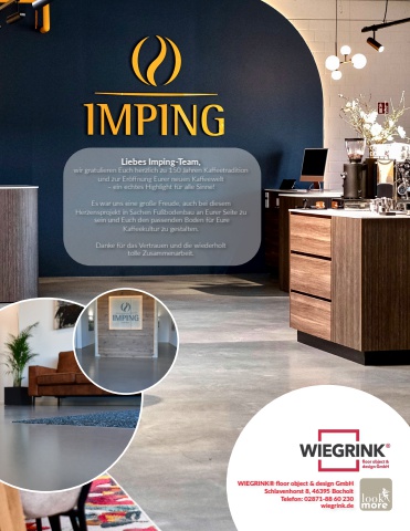 SONNTAGOFFEN19.09.202113.03.2022OFFENWIEGRINK%u00ae fl oor object & design GmbHSchlavenhorst 8, 46395 BocholtTelefon: 02871-88 60 230 wiegrink.deLiebes Imping-Team,wir gratulieren Euch herzlich zu 150 Jahren Kaff eetraditi on und zur Er%u00f6ff nung Eurer neuen Kaff eewelt %u2013 ein echtes Highlight f%u00fcr alle Sinne!Es war uns eine gro%u00dfe Freude, auch bei diesem Herzensprojekt in Sachen Fu%u00dfbodenbau an Eurer Seite zu sein und Euch den passenden Boden f%u00fcr EureKaff eekultur zu gestalten.Danke f%u00fcr das Vertrauen und die wiederholt tolle Zusammenarbeit.