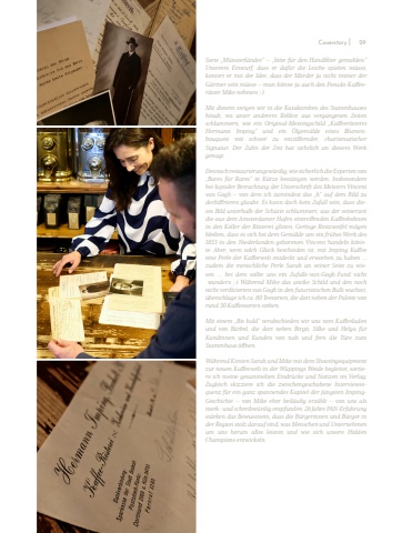 Sorte %u201eM%u00fcnsterl%u00e4nder%u201c %u2013 %u201ebitte f%u00fcr den Handfilter gemahlen.%u201c Unserem Einwurf, dass er daf%u00fcr die Leiche spielen m%u00fcsse, kontert er mit der Idee, dass der M%u00f6rder ja nicht immer der G%u00e4rtner sein m%u00fcsse %u2013 man k%u00f6nne ja auch den Pseudo-Kaffeer%u00f6ster Mike nehmen ;-) Mit diesem steigen wir in die Katakomben des Stammhauseshinab, wo unter anderem Relikte aus vergangenen Zeiten schlummern, wie ein Original-Messingschild %u201eKaffeer%u00f6stereiHermann Imping%u201c und ein %u00d6lgem%u00e4lde eines Blumenbouquets mit schwer zu entziffernder, charismatischer Signatur. Der Zahn der Zeit hat sichtlich an diesem Werk genagt.Dennoch restaurierungsw%u00fcrdig, wie sicherlich die Experten von %u201eBares f%u00fcr Rares%u201c in K%u00fcrze best%u00e4tigen werden. Insbesondere bei lupialer Betrachtung der Unterschrift des Meisters Vincent van Gogh %u2013 von dem ich zumindest das %u201eh%u201c auf dem Bild zu dechiffrieren glaube. Es kann doch kein Zufall sein, dass dieses Bild unterhalb der Sch%u00fctte schlummert, aus der seinerzeit die aus dem Amsterdamer Hafen eintreffenden Kaffeebohnen in den Keller der R%u00f6sterei glitten. Geringe Restzweifel m%u00f6gen bleiben, dass es sich bei dem Gem%u00e4lde um ein fr%u00fches Werk des 1853 in den Niederlanden geborenen Vincent handeln k%u00f6nnte. Aber, wem solch Gl%u00fcck beschieden ist, mit Imping Kaffee eine Perle der Kaffeewelt entdeckt und erworben zu haben %u2026 zudem die menschliche Perle Sarah an seiner Seite zu wissen %u2026 bei dem sollte uns ein Zufalls-van-Gogh-Fund nicht wundern ;-) W%u00e4hrend Mike das antike Schild und den noch nicht verifizierten van Gogh in den futuristischen Bulli wuchtet, %u00fcberschlage ich ca. 80 Teesorten, die dort neben der Palette von rund 30 Kaffeesorten stehen. Mit einem %u201eBis bald%u201c verabschieden wir uns vom Kaffeeladen und von B%u00e4rbel, die dort neben Birgit, Silke und Helga f%u00fcr Kundinnen und Kunden von nah und fern die T%u00fcre zum Stammhaus %u00f6ffnen. W%u00e4hrend Kirsten Sarah und Mike mit dem Shootingequipment zur neuen Kaffeewelt in der W%u00fcppings Weide begleitet, sortiere ich meine gesammelten Eindr%u00fccke und Notizen im Verlag. Zugleich skizziere ich die zwischengeschobene Interviewsequenz f%u00fcr ein ganz spannendes Kapitel der j%u00fcngsten ImpingGeschichte %u2013 von Mike eher beil%u00e4ufig erz%u00e4hlt %u2013 von uns als merk- und schreibw%u00fcrdig empfunden. 26 Jahre PAN-Erfahrung st%u00e4rken das Bewusstsein, dass die B%u00fcrgerinnen und B%u00fcrger in der Region stolz darauf sind, was Menschen und Unternehmenum uns herum alles leisten und wie sich unsere Hidden Champions entwickeln. Coverstory I 29
