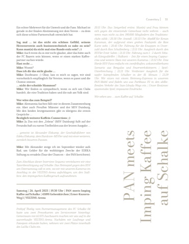 Ein echter Mehrwert f%u00fcr die Umwelt und die Fans. Michael ist gerade in der finalen Abstimmung mit dem Verein %u2013 zu dem sich diese sch%u00f6ne Partnerschaft entwickelt hat. Sag mal %u2026 ist das nicht ein sch%u00f6nes Gef%u00fchl, seinem Herzensverein auch businesstechnisch so nahe zu sein? Kann man(n) da nicht mal eine Runde stolz sein? ;-) Mike: Auch wenn du es mir nicht glaubst, aber das h%u00e4tte auch der FC Bayern sein k%u00f6nnen, wenn er einen starken Kaffeepartner suchen w%u00fcrde. Hast recht %u2026 Mike: Womit? Dass ich dir das nicht glaube %u2026 Mike: Doofmann ;-) Okay, lass es mich so sagen, wir sind vornehmlich empf%u00e4nglich f%u00fcr Vereine, wenn es passt und die Chemie stimmt. %u2026 nicht der schn%u00f6de Mammon? Mike: Wir finden es sympathisch, wenn es sich um Clubs handelt, die eine Tradition haben und die nah am Volk sind. Wer w%u00e4re das zum Beispiel? Mike: Alemannia Aachen f%u00e4llt mir in diesem Zusammenhang ein. Aber auch Preu%u00dfen M%u00fcnster und der MSV Duisburg. Mit den beiden letztgenannten gibt es %u00fcbrigens die ersten Gespr%u00e4che %u2026 Bez%u00fcglich weiterer Koffein-Connections ;-) Mike: Ja. Das mit den %u201eZebras%u201c (MSV Duisburg) fu%u00dft auf der Freundschaft zu eurem Titelhelden aus der letzten Ausgabe %u2026 %u2026 gemeint ist Alexander Elskamp, der Gesch%u00e4ftsf%u00fchrer von Edeka Elskamp, dem Hardcore-MSVler und mit einer weiteren, ziemlich bizarren Passion. Mike: Mit Alexander steige ich im September wieder aufs Rad, um Gelder f%u00fcr die wohlt%u00e4tigen Zwecke der EDEKA Stiftung zu erradeln (Tour der Chancen %u2013 der PAN berichtete). Zum Abschluss dieser Interview-Sequenz vereinbaren wir eine Tatortbesichtigung auf Schalke. Das Heimspiel gegen den HSV am Ostersamstag soll es sein, wo wir mit unseren Kameras im Anschlag in der VELTINS-Arena aufschlagen, um den Stallbzw. den impingschen Kaffeegeruch aufzunehmen. Samstag | 26. April 2025 | 19.30 Uhr | PAN meets Imping Kaffee auf Schalke | 45891 Gelsenkirchen | Ernst-KuzorraWeg 1 | VELTINS-Arena Frithjof Theilig vom Partnermanagement des FC Schalke 04 hatte uns zwei Pressekarten am Servicecenter hinterlegt.Gemeinsam mit 62.075 Zuschauern machen wir uns auf in die ausverkaufte VELTINS-Arena. Nachdem wir Laufwege und Fotospots erkundet haben, nehmen wir zwei Pl%u00e4tze innerhalb des LaOla-Clubs ein. 20.15 Uhr. Das Steigerlied ert%u00f6nt. Man(n) und Frau k%u00f6nnen sich gegen die einsetzende G%u00e4nsehaut nicht wehren %u2013 auch wenn man nicht zu den 190.000 Mitgliedern des Traditionsclubs z%u00e4hlt. | 20.30 Uhr. Ansto%u00df. | 20.33 Uhr. Abpfiff f%u00fcr Kenan Karaman, der aufgrund eines groben Foulspiels die Rote Karte sieht. | 20.45 Uhr. F%u00fchrung f%u00fcr die Knappen in Unterzahl durch Ron Schallenberg. | 21.11 Uhr. Ausgleich durch denHSVler Emir Sahiti. | 21.13 Uhr. F%u00fchrung zum 1 : 2 durch Yeboah K%u00f6nigsd%u00f6rffer. | Halbzeit %u2013 Zeit f%u00fcr einen Imping Cappuccino und weitere Shots mit unseren Kameras. | 21.52 Uhr. Eine Horde HSV-Fans entfacht ein zweifelhaftes, unkontrollierbares Szenario aus Bengalos und Feuerwerksk%u00f6rpern. | SpielUnterbrechung. | 22.21 Uhr. Verdienter Ausgleich f%u00fcr die tapfer k%u00e4mpfenden Schalker in der 81. Minute. | 23.29 Uhr. Wir sitzen mit einem Heimweg-Espresso in unserem PAN-Mobil und f%u00e4deln uns aus Parkhaus P2 in den abflie%u00dfenden Verkehr des Stan-Libuda-Wegs ein. | Unser Res%u00fcmee: spannendes Spiel, imposante Eindr%u00fccke. Wir sehen uns %u2026 zum Kaffee auf Schalke. PAN meets Imping Kaffee auf SchalkeCoverstory I 33