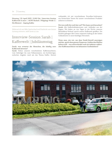 Dienstag | 29. April 2025 | 13.00 Uhr | Interview-Session Kaffeewelt & more | 46395 Bocholt | W%u00fcppings Weide 2 | Die R%u00f6sterei %u2013 Imping Kaffee W%u00e4hrend ich mit Mike Spielverlauf und Eindr%u00fccke vom letzten Samstag er%u00f6rterte, st%u00f6%u00dft Sarah zu uns. Interview-Session Sarah |Kaffeewelt | Jubil%u00e4umstag Sarah, was erwartet die Menschen, die k%u00fcnftig eure Kaffeewelt betreten? Sarah: Neben unseren verschiedenen Kaffeemaschinen, vom Siebtr%u00e4ger bis zum Vollautomaten, ein hochwertiges, stylisches Angebot rund um das Thema Kaffee. Derzeit verhandele ich mit verschiedenen Porzellan-Lieferanten, um formsch%u00f6ne Tassen f%u00fcr unsere verschiedenen Produkte anbieten zu k%u00f6nnen. F%u00fcr wen stellt ihr euch hier auf? Wer kann euch besuchen? Sarah: Alle Kaffeeliebhaberinnen und -liebhaber aus der Region. Wir haben an vier Tagen in der Woche unseren Manufaktur-Verkauf, sprich unsere Kaffeewelt ge%u00f6ffnet. Die Kunden gelangen %u00fcber einen separaten Aufzug an der linken Geb%u00e4udeseite in unser k%u00fcnftiges Herzst%u00fcck. Wenn man, wie wir, aus dem Nestl%u00e9-Kartell aussteigen m%u00f6chte, sprich dem ganzen Nespresso-Ged%u00f6ns den R%u00fccken kehren will %u2013 was unterscheidet euch als Anbieter zahlreicher Kaffeemaschinen von bekannten Gro%u00dfm%u00e4rkten? 34 I Coverstory