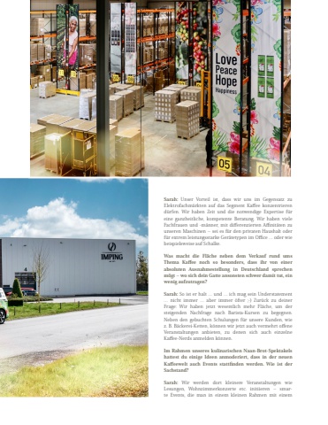 Sarah: Unser Vorteil ist, dass wir uns im Gegensatz zu Elektrofachm%u00e4rkten auf das Segment Kaffee konzentrieren d%u00fcrfen. Wir haben Zeit und die notwendige Expertise f%u00fcr eine ganzheitliche, kompetente Beratung. Wir haben viele Fachfrauen und -m%u00e4nner, mit differenzierten Affinit%u00e4ten zu unseren Maschinen %u2013 sei es f%u00fcr den privaten Haushalt oder f%u00fcr extrem leistungsstarke Ger%u00e4tetypen im Office %u2026 oder wie beispielsweise auf Schalke. Was macht die Fl%u00e4che neben dem Verkauf rund ums Thema Kaffee noch so besonders, dass ihr von einer absoluten Ausnahmestellung in Deutschland sprechen m%u00f6gt %u2013 wo sich dein Gatte ansonsten schwer damit tut, ein wenig aufzutragen? Sarah: So ist er halt %u2026 und %u2026 ich mag sein Understatement %u2026 nicht immer %u2026 aber immer %u00f6fter ;-) Zur%u00fcck zu deiner Frage: Wir haben jetzt wesentlich mehr Fl%u00e4che, um der steigenden Nachfrage nach Barista-Kursen zu begegnen. Neben den gebuchten Schulungen f%u00fcr unsere Kunden, wie z.%u00a0B. B%u00e4ckerei-Ketten, k%u00f6nnen wir jetzt auch vermehrt offeneVeranstaltungen anbieten, zu denen sich auch einzelne Kaffee-Nerds anmelden k%u00f6nnen. Im Rahmen unseres kulinarischen Naan-Brot-Spektakels hattest du einige Ideen anmoderiert, dass in der neuen Kaffeewelt auch Events stattfinden werden. Wie ist der Sachstand? Sarah: Wir werden dort kleinere Veranstaltungen wie Lesungen, Wohnzimmerkonzerte etc. initiieren %u2013 smarte Events, die man in einem kleinen Rahmen mit einem