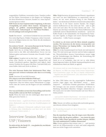 ausgew%u00e4hlten Publikum veranstalten kann. Daneben stellen wir die Fl%u00e4che Unternehmen in der Region zur Verf%u00fcgung, die ihren Mitarbeitern, Partnern, Kunden etc. einen Tapetenwechsel g%u00f6nnen wollen %u2026 B2B-Events in einer inspirierenden Umgebung, in der man zwangsl%u00e4ufig auf andere Ideen kommt. Strategisch gutgelegen, im gr%u00f6%u00dften zusammenh%u00e4ngenden und voll erschlossenen Industriepark in Nordrhein-Westfalen %u2013 wie ich unl%u00e4ngst noch mal gelesen habe. Sarah: Das stimmt %u2026 auch dieser Gedanke hat uns umtrieben. Den vielen Big Playern, Hidden Champions, tollen Unternehmen in der Region bieten wir eine Fl%u00e4che f%u00fcr alle denkbaren Business-Anl%u00e4sse. Ein weiterer Vorteil %u2026 bei eurem Konzept ist der Trend zu Non-Alkohol-Veranstaltungen inkludiert. Sarah: Auch das ist richtig. Neben unseren Kaffee-Spezialit%u00e4ten wird es die S%u00e4fte und alkoholfreien Seccos von van Nahmen geben und weitere Getr%u00e4nke ohne Promille-Umdrehungen ;-) Mike erg%u00e4nzt: So gehen wir an den Start %u2026 aber %u2026 ich habe schon erste Skizzen zu einem eigenen Imping-Wein auf Sarahs Schreibtisch gesehen. Eigentlich auch logisch, dank unserer Vorliebe f%u00fcr ein gutes Glas Wein. Und dann f%u00fchlt sich unser Kaffee-Lik%u00f6r auch nicht so alleine ;-) Wie viele Personen finden hier idealerweise Platz, ohne dass man sich verloren vorkommt oder dass es zu wuselig wird? Sarah: Zwischen 50 und 100 Personen. Wie schaut es mit dem leiblichen Wohl aus? Sarah: Wir haben bewusst keine eigene K%u00fcche vorgeplant/eingerichtet. Aber wir haben unsere Nebenr%u00e4ume so ausgestattet, dass die Caterer aus der Region sich dort wohlf%u00fchlen werden. Wer von euch beiden serviert das Storytelling rund um das Thema Kaffee und um die Welt von Imping? Sarah: Wenn die Leute viel Zeit mitbringen, dann lasse ich Mike gerne den Vortritt ;-) Eine kleine Spitze %u2013 zugleich ein Hinweis auf die unterschiedlichen Redeanteile und den Grad der Erz%u00e4hlfreudigkeit der beiden ;-) Mit einem s%u00fcffisanten Schmunzeln entfleucht Sarah wieder in Richtung ihres Schreibtisches und l%u00e4sst mich mit ihrem %u201ewortkargen%u201c Gatten zur%u00fcck ;-) Interview-Session Mike | USP | Visionen Da zieht sie hin, die Sarah 2.0 %u2026 was glaubst du, was k%u00f6nnte irgendwann 3.0 werden? Mike: M%u00f6glicherweise der gemeinsame Wunsch, irgendwann nur noch von dort Kaffeebohnen zu importieren und zu r%u00f6sten, wo wir einen direkten Bezug zu den Plantagen haben %u2013 eine l%u00fcckenlose Lieferkette zwischen den anbauenden Farmern bis in die Tassen unserer Kunden. Bei einigen unserer Kaffeesorten ist das schon der Fall %u2013 aber es gibt noch Luft nach oben. Wo wir beim Thema Luft sind %u2026 wir k%u00f6nnen uns durchaus vorstellen, das Thema Kaffeereise auch au%u00dferhalb unserer R%u00e4umlichkeiten anzubieten %u2013 sprich mit Kaffee-Freaks in die Anbaul%u00e4nder, wie beispielsweise Tansania oder Uganda, zu fliegen und unsere Partner-Plantagen aufzusuchen %u2013 Coffee-Touren sozusagen. Es scheint so, als wenn euch die Ideen niemals ausgehen werden. Wie bewertest du die letzten zwanzig Jahre seit deiner %u00dcbernahme von Imping Kaffee %u2013 was macht den Erfolg der Marke aus? Mike: Es ist das Zusammenspiel von Sarah, mir und unserem Team. Wir sind extrem gut vernetzt und wir haben aufgrund der %u00dcbersichtlichkeit unseres Unternehmens immer z%u00fcgig auf die Ver%u00e4nderungen des Marktes, die Entwicklung der Kaffeekultur reagieren k%u00f6nnen. Sarah ist es zu verdanken, dass wir vor ca. zehn Jahren damit begonnen haben, die Marke Imping aufzupolieren und selbstbewusst damit am Markt zu agieren. Ich erinnere mich an einen Rundgang vor einiger Zeit durch die R%u00f6sterei, wo Mike uns einige seiner letzten Verpackungst%u00fcten-Experimente zeigte, die dort in Stapeln schlummerten %u2013 begleitet von dem Kommentar: %u201eLila, mein letzter Versuch %u2013 und dann kam Sarah.%u201c Im Jahre 2018 haben wir die urspr%u00fcngliche Kaffeebohne unseres Logos gegen eine Welt-Bohne ersetzt %u2013 unser Anspruch %u2026 inzwischen Realit%u00e4t gewordene Wirklichkeit. Wir bewegen uns mit unseren Produkten auf Messen in Hamburg, D%u00fcsseldorf, M%u00fcnchen, Stuttgart, Amsterdam etc. Wir waren jetzt vier Jahre hintereinander auf einer Messe in Dubai pr%u00e4sent %u2026%u2026 und auf dem Haldern Pop Festival %u2013 ein Garant f%u00fcr weltweites Durchstarten, zumindest musikalisch gesehen ;-) Mike: Stimmt, wir sollten uns dieses Jahr mal wieder gemeinsam diesem sch%u00f6nen Event hingeben. Per Handschlag besiegeln wir dieses Versprechen %u2026 weiter im Text %u2026 in den Fragen: Hast du manchmal Sorge, dass ihr wegen eurer %u00fcbersichtlichen Gr%u00f6%u00dfe, die du gerne anf%u00fchrst %u2026 von einem der ganz gro%u00dfen Coffee-Player geschluckt werden k%u00f6nntet, %u00e4hnlich wie viele ambitionierte Craftbier-Brauereien? Mike: Erstens geh%u00f6ren dazu immer zwei ;-) %u2026 und zweitens sind wir als Vollsortimentler so breit und stabil aufgestellt, dass uns solche Fragen nicht umtreiben. Coverstory I 37