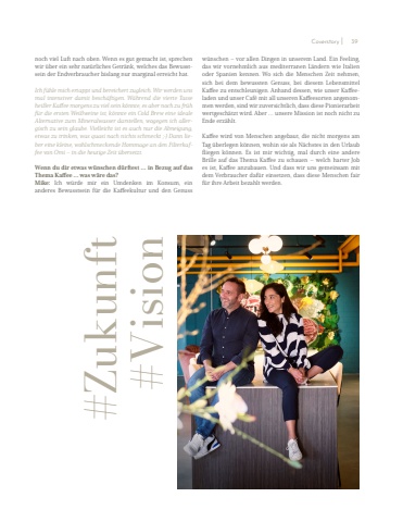 noch viel Luft nach oben. Wenn es gut gemacht ist, sprechen wir %u00fcber ein sehr nat%u00fcrliches Getr%u00e4nk, welches das Bewusstsein der Endverbraucher bislang nur marginal erreicht hat. Ich f%u00fchle mich ertappt und bereichert zugleich. Wir werden uns mal intensiver damit besch%u00e4ftigen. W%u00e4hrend die vierte Tasse hei%u00dfer Kaffee morgens zu viel sein k%u00f6nnte, es aber noch zu fr%u00fch f%u00fcr die ersten Wei%u00dfweine ist, k%u00f6nnte ein Cold Brew eine ideale Alternative zum Mineralwasser darstellen, wogegen ich allergisch zu sein glaube. Vielleicht ist es auch nur die Abneigung, etwas zu trinken, was quasi nach nichts schmeckt ;-) Dann lieber eine kleine, wohlschmeckende Hommage an den Filterkaffee von Omi %u2013 in die heutige Zeit %u00fcbersetzt. Wenn du dir etwas w%u00fcnschen d%u00fcrftest %u2026 in Bezug auf das Thema Kaffee %u2026 was w%u00e4re das? Mike: Ich w%u00fcrde mir ein Umdenken im Konsum, ein anderes Bewusstsein f%u00fcr die Kaffeekultur und den Genuss w%u00fcnschen %u2013 vor allen Dingen in unserem Land. Ein Feeling, das wir vornehmlich aus mediterranen L%u00e4ndern wie Italien oder Spanien kennen. Wo sich die Menschen Zeit nehmen, sich bei dem bewussten Genuss, bei diesem Lebensmittel Kaffee zu entschleunigen. Anhand dessen, wie unser Kaffeeladen und unser Caf%u00e9 mit all unseren Kaffeesorten angenommen werden, sind wir zuversichtlich, dass diese Pionierarbeit wertgesch%u00e4tzt wird. Aber %u2026 unsere Mission ist noch nicht zu Ende erz%u00e4hlt. Kaffee wird von Menschen angebaut, die nicht morgens am Tag %u00fcberlegen k%u00f6nnen, wohin sie als N%u00e4chstes in den Urlaub fliegen k%u00f6nnen. Es ist mir wichtig, mal durch eine andere Brille auf das Thema Kaffee zu schauen %u2013 welch harter Job es ist, Kaffee anzubauen. Und dass wir uns gemeinsam mit dem Verbraucher daf%u00fcr einsetzen, dass diese Menschen fair f%u00fcr ihre Arbeit bezahlt werden. #Zukunft #VisionCoverstory I 39