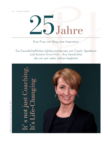 25JahreEine Frau, ein Weg, eine InspirationEin freundschaftliches Jubil%u00e4umsinterview mit Coach, Speakerinund Autorin Erna H%u00fcls %u2013 ihre Geschichte, die uns seit vielen Jahren begleitet.Advertorial I Foto & Text: Kirsten Bu%u00df 42 I Living & Lifestyle