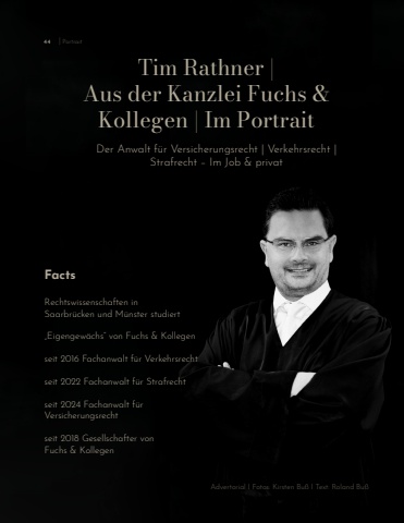 Tim Rathner | Aus der Kanzlei Fuchs & Kollegen | Im PortraitDer Anwalt f%u00fcr Versicherungsrecht | Verkehrsrecht | Strafrecht %u2013 Im Job & privatFactsRechtswissenschaften in Saarbr%u00fccken und M%u00fcnster studiert%u201eEigengew%u00e4chs%u201c von Fuchs & Kollegenseit 2016 Fachanwalt f%u00fcr Verkehrsrecht seit 2022 Fachanwalt f%u00fcr Strafrechtseit 2024 Fachanwalt f%u00fcr Versicherungsrecht seit 2018 Gesellschafter von Fuchs & KollegenAdvertorial I Fotos: Kirsten Bu%u00df I Text: Roland Bu%u00df 44 I Portrait