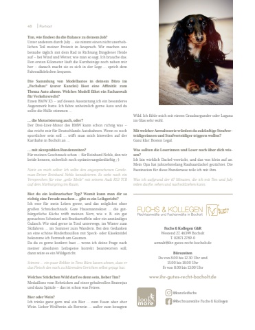 Fuchs & Kollegen GbRWestend 27, 46399 BocholtT. 02871 2789-0anwalt@ihr-gutes-recht-bocholt.deB%u00fcrozeitenDo von 8.00 bis 12.30 Uhr und 15.00 bis 18.00 UhrFr von 8.00 bis 13.00 Uhrwww.ihr-gutes-recht-bocholt.de @kanzleifuchs @Rechtsanw%u00e4lte Fuchs & Kollegen Tim, wie findest du die Balance zu deinem Job? Unter anderem durch July %u2026 sie nimmt einen nicht unerheblichen Teil meiner Freizeit in Anspruch. Wir machen uns beinahe t%u00e4glich mit dem Rad in Richtung Dingdener Heide auf %u2013 bei Wind und Wetter, wie man so sagt. Ich brauche das. Den ersten Kilometer l%u00e4uft die Kurzbeinige noch neben mir her %u2013 danach macht sie es sich in der Loge %u2026 sprich dem Fahrradk%u00f6rbchen bequem. Die Sammlung von Modellautos in deinem B%u00fcro im %u201eFuchsbau%u201c (eurer Kanzlei) l%u00e4sst eine Affinit%u00e4t zum Thema Auto ahnen. Welches Modell f%u00e4hrt ein Fachanwalt f%u00fcr Verkehrsrecht? Einen BMW X3 %u2013 auf dessen Ausstattung ich ein besonderes Augenmerk hatte. Ich fahre unheimlich gerne Auto und da sollte die H%u00fclle stimmen %u2026%u2026 die Motorisierung auch, oder? Der Drei-Liter-Motor des BMW kann schon richtig was %u2013 das reicht mir f%u00fcr Deutschlands Autobahnen. Wenn es noch sportlicher sein soll %u2026 trifft man mich bisweilen auf der Kartbahn in Bocholt an %u2026%u2026 mit akzeptablen Rundenzeiten? F%u00fcr meinen Geschmack schon %u2013 f%u00fcr Reinhard Nehls, den wir beide kennen, sicherlich noch optimierungsbed%u00fcrftig ;-) Notiz an mich selbst: Ich sollte den angesprochenen Gentleman-Driver Reinhard Nehls kontaktieren. Es steht noch ein Versprechen f%u00fcr eine %u201egeile Meile%u201c mit seinem Audi RS3 TCR auf dem N%u00fcrburgring im Raum. Bist du ein kulinarischer Typ? Womit kann man dir so richtig eine Freude machen %u2026 gibt es ein Leibgericht? Ich esse f%u00fcr mein Leben gerne, und das m%u00f6glichst ohne gro%u00dfen Schnickschnack. Gute Hausmannskost %u2026 die gutb%u00fcrgerliche K%u00fcche trifft meinen Nerv, wie z. B. ein gut gemachtes Schnitzel mit Bratkartoffeln oder ein anst%u00e4ndiges Gulasch. Wir sind gerne in Tirol unterwegs, im Winter zum Skifahren %u2026 im Sommer zum Wandern. Bei den Gedanken an eine sch%u00f6ne Rinderbouillon mit Speck- oder K%u00e4sekn%u00f6del bekomme ich Fernweh am Gaumen. Da du es gerne konkret hast %u2026 wenn ich deine Frage nach meiner absoluten Leibspeise korrekt beantworten soll,dann w%u00e4re es ein Wildgericht.Stimmt %u2026 ein paar Relikte in Tims B%u00fcro lassen ahnen, dass er das Fleisch des noch zu kl%u00e4renden Gerichtes selbst gejagt hat. Welches St%u00fcckchen Wild darf es denn sein, lieber Tim? Medaillons vom Rehr%u00fccken auf einer gehaltvollen Bratenjus und dazu Sp%u00e4tzle %u2013 das ist schon was Feines. Bier oder Wein? Ich trinke ganz gern mal ein Bier %u2026 zum Essen aber eher Wein. Lieber Wei%u00dfwein als Rotwein %u2026 au%u00dfer zum besagten Wild. Ich f%u00fchle mich mit einem Grauburgunder oder Lugana im Glas sehr wohl. Mit welcher Anwaltsserie w%u00fcrdest du zuk%u00fcnftige Strafverteidigerinnen und Strafverteidiger triggern wollen? Ganz klar: Boston Legal. Was sollten die Leserinnen und Leser noch %u00fcber dich wissen? Ich bin wirklich Dackel-verr%u00fcckt, und das von klein auf an. Mein Opa hat jahrzehntelang Rauhaardackel gez%u00fcchtet. Die Faszination f%u00fcr diese Hunderasse teile ich mit ihm. Was ich aufgrund der 67 Minuten, die ich mit Tim und July teilen durfte, sehen und nachvollziehen kann. 48 I Portrait